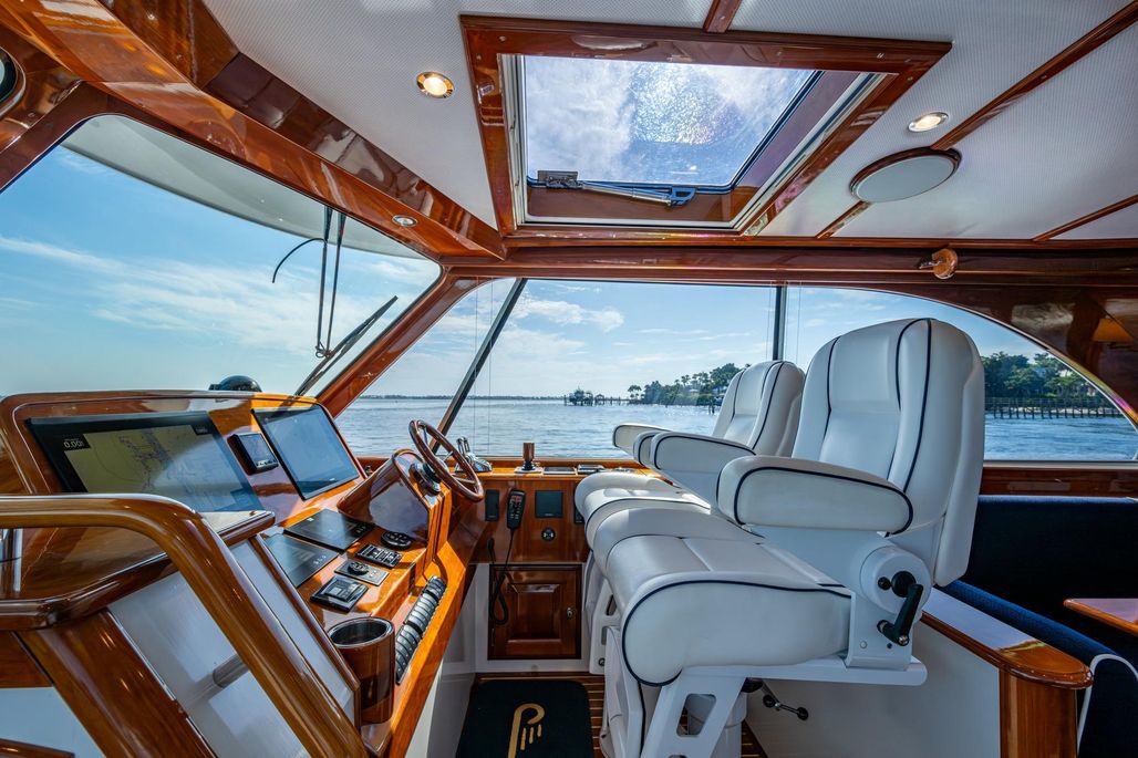 - Pilothouse overhead hatches: Two (2) powered hatches on pilothouse roof each with SkyScreen blind/screens. Hatch undersides are trimmed in varnished Cherry