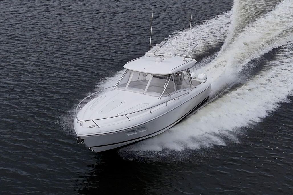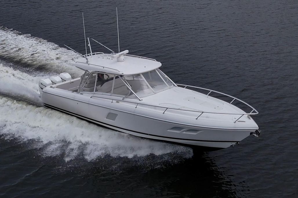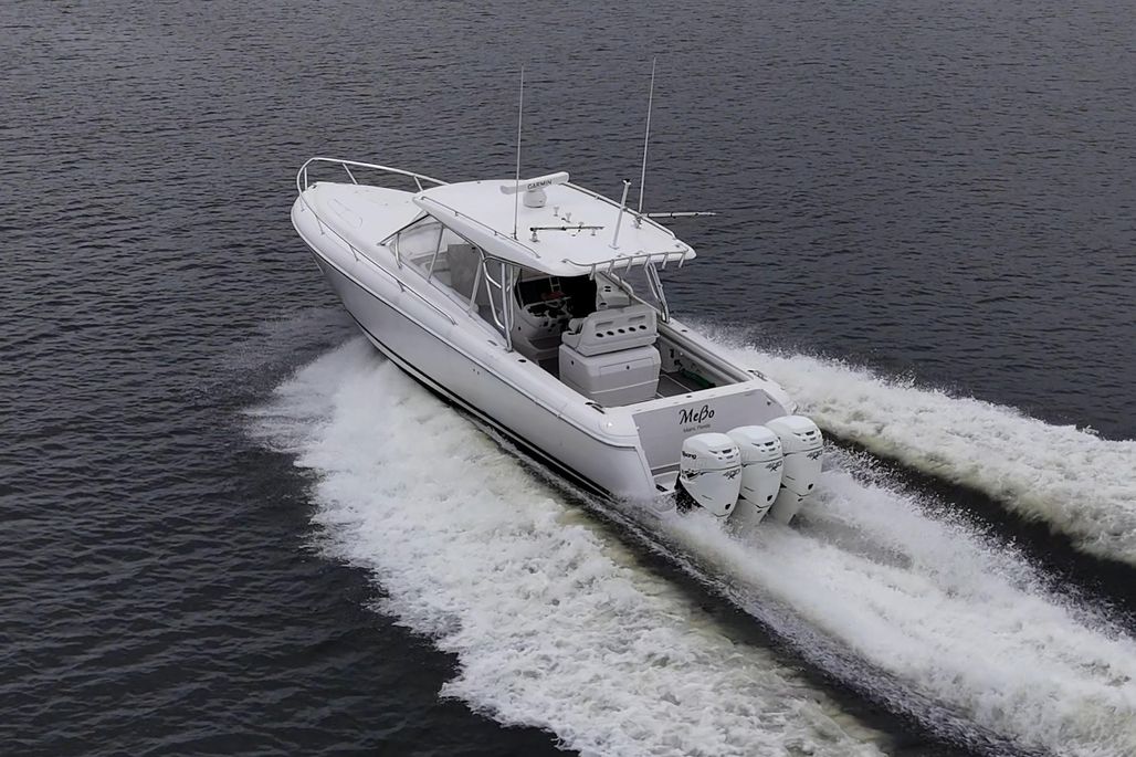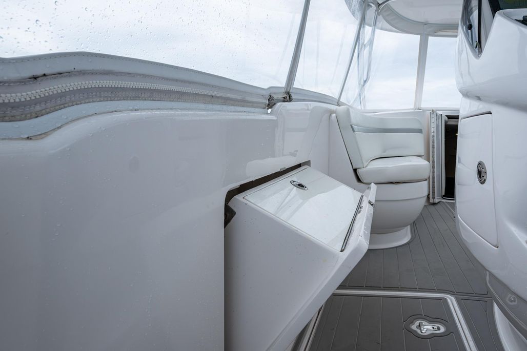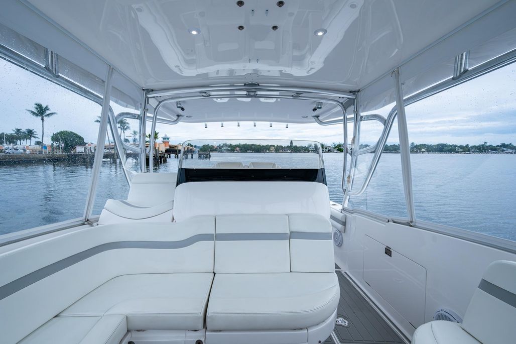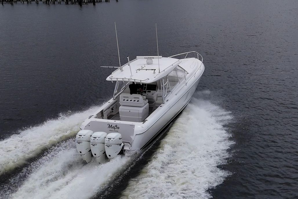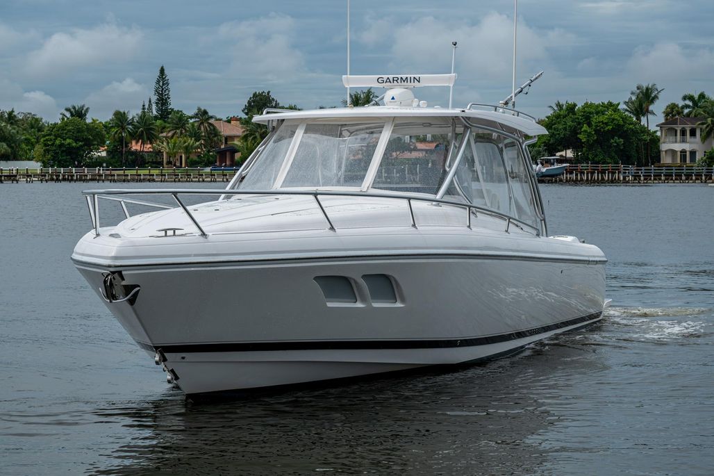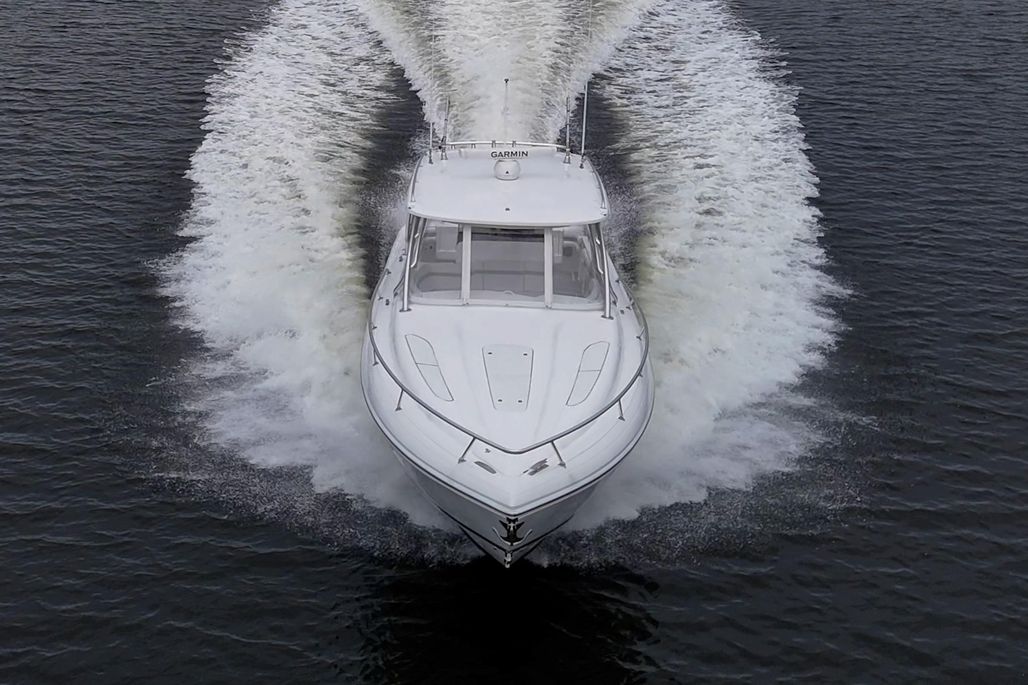 The Intrepid 407 Cuddy is one of the most popular and desirable models that Intrepid has produced over the years. The deck plan offers a versatile platform making it enjoyable for multiple use. Up forward you have a spacious air-conditioned interior cabin that can accommodate sleeping up to 4 guests, a mini galley, and a separate enclosed head. Forward of the helm station is an open walking area surrounded by the forward seating, and this area is protected by isinglass enclosure. Behind the helm station is your cockpit space with a dive door, transom fold-out bench seat, access to main bilge compartment, generator and Seakeeper access as well, and the space is equipped for all of your offshore fishing needs with rod holders, and fishboxes.