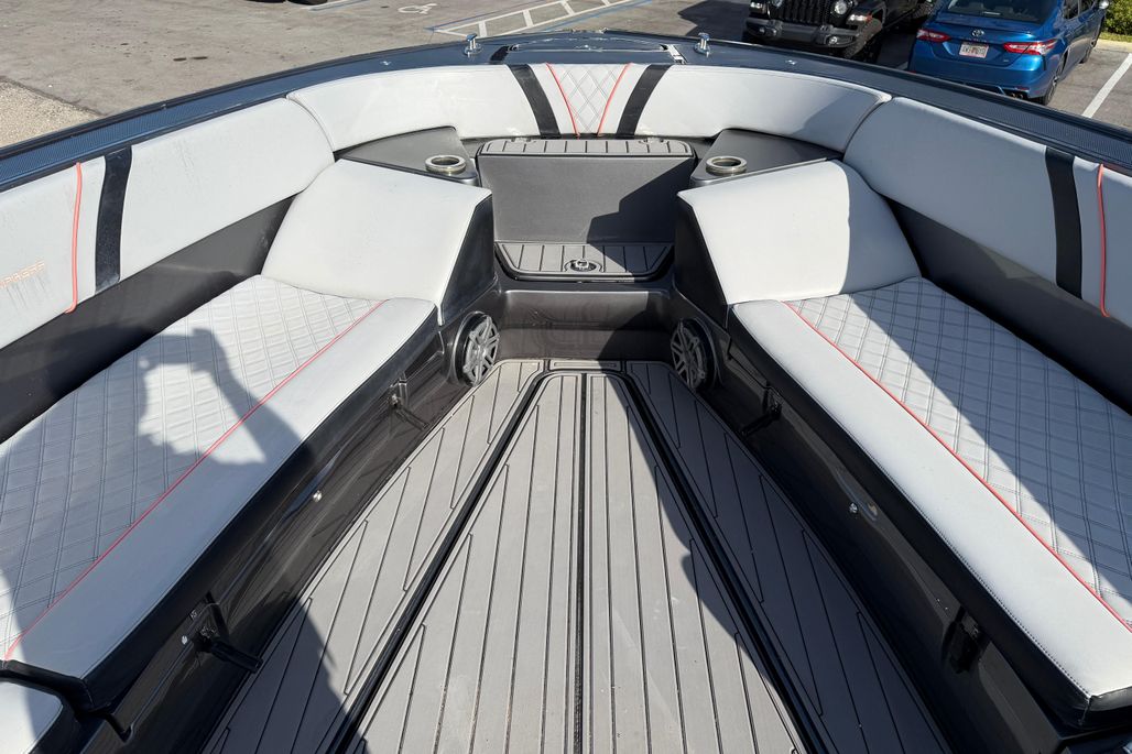 - Convenient and thoughtful details: Features like the side boarding dive door with a swim ladder, pop-up cleats, and hidden storage for fenders and gear add to the boat’s functionality and clean lines.