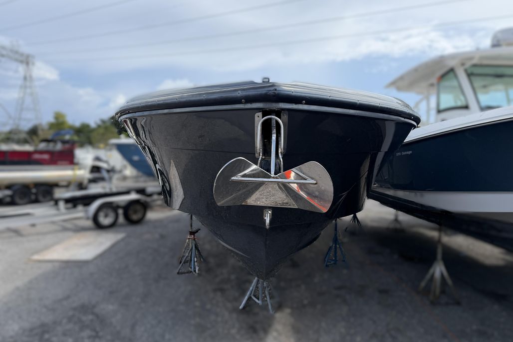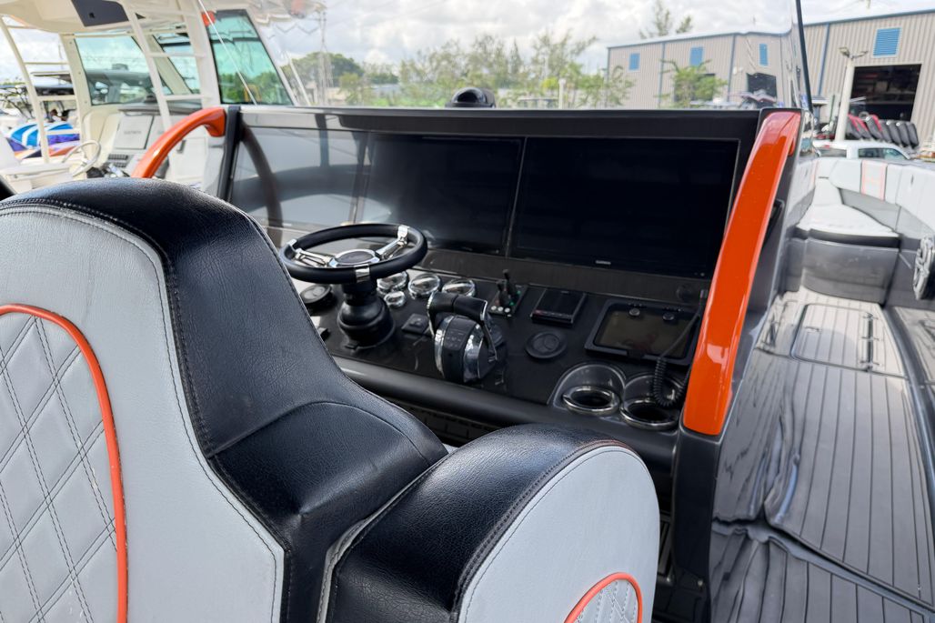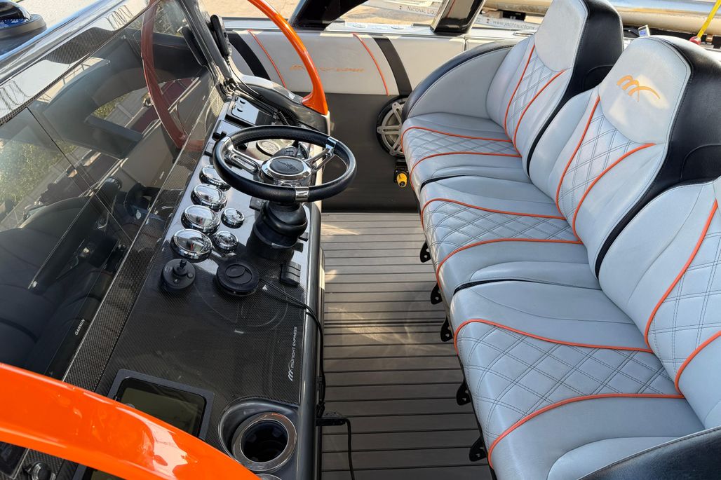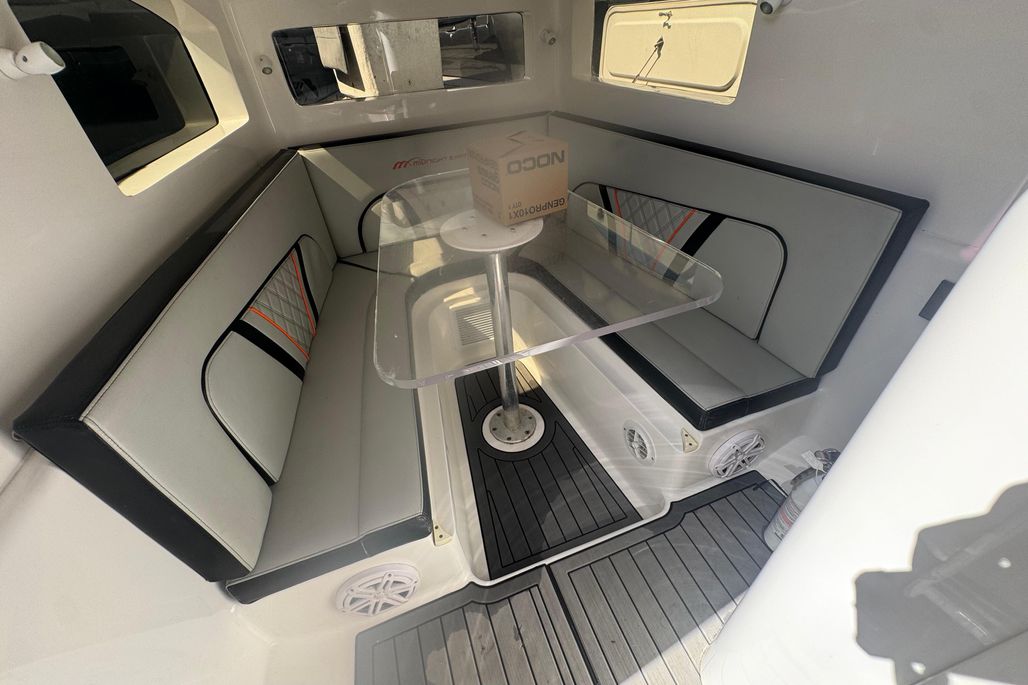 - Cutting-edge technology at the helm: The modern dash is equipped with large Garmin display screens for navigation, engine data, and vessel systems, and a bow thruster for effortless docking.