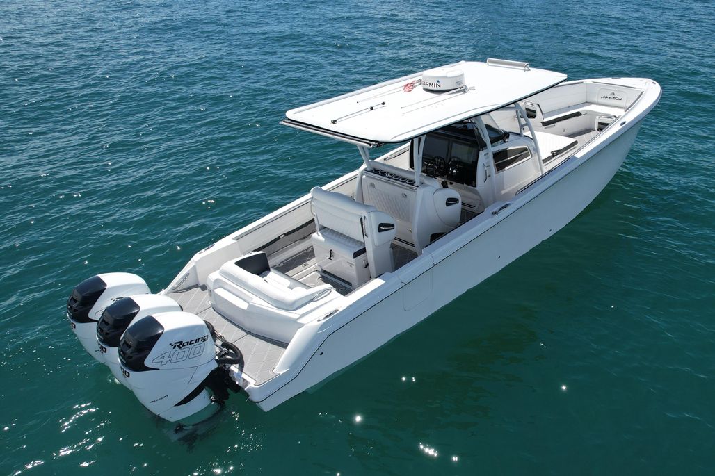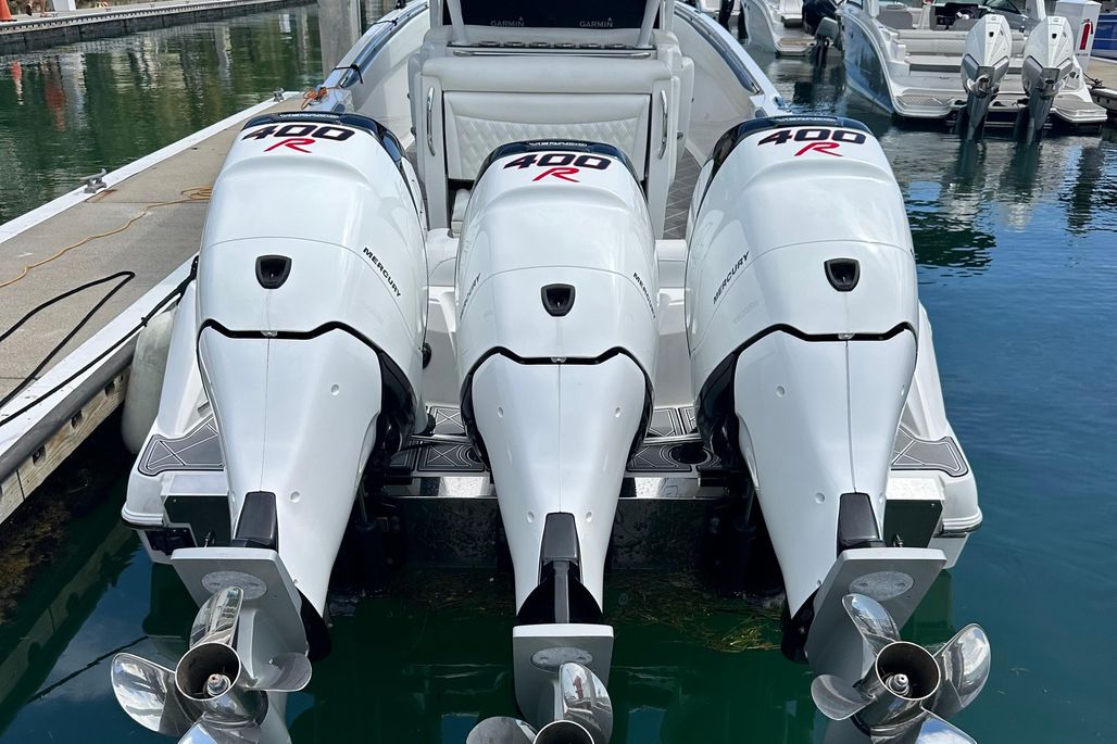 Powered by triple Mercury 400Rs, the 390 delivers exhilarating speed and a remarkably smooth ride. The expansive deck layout includes forward lounges, versatile bow seating with a rise-and-fall table, a second row of cockpit seating, and comfortable aft bench seats—ideal for entertaining or relaxing.