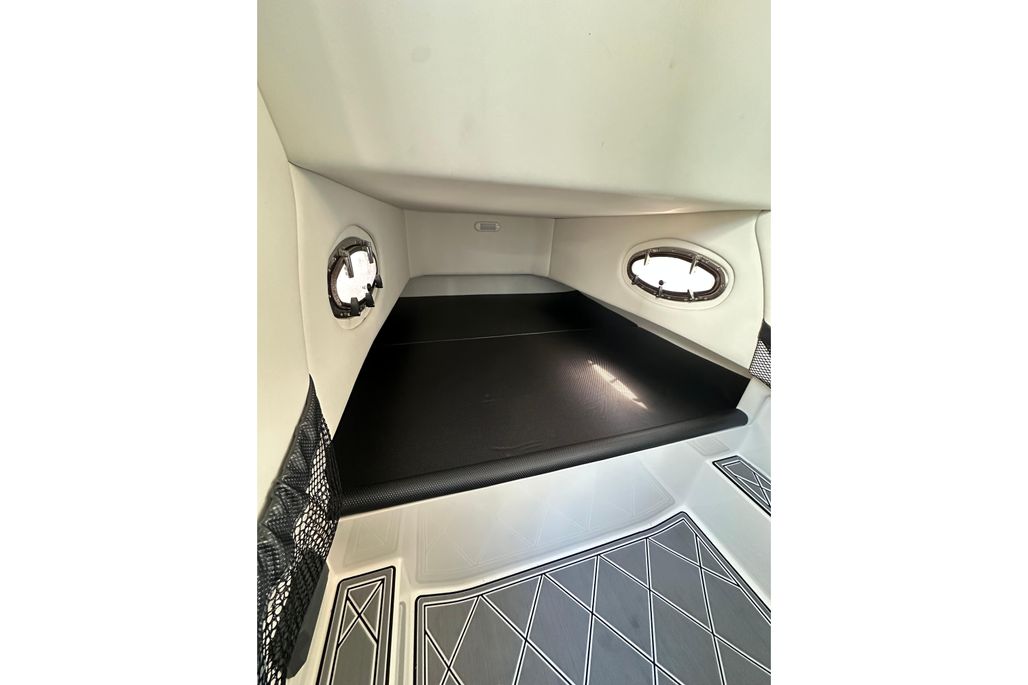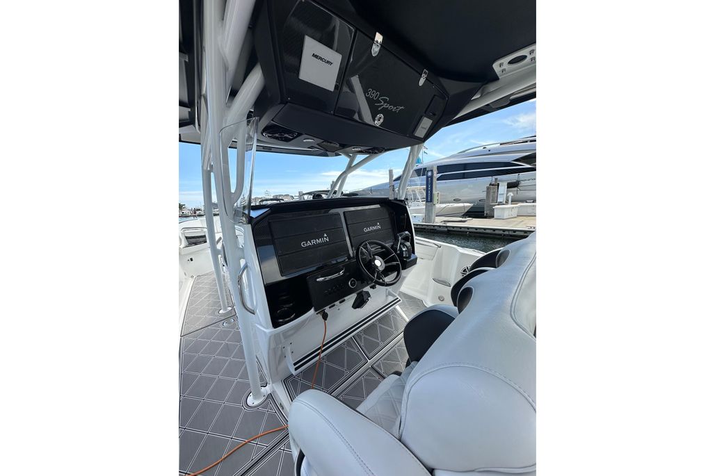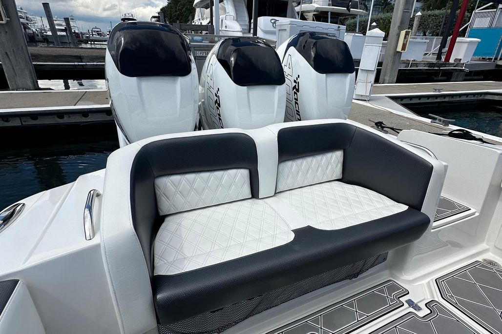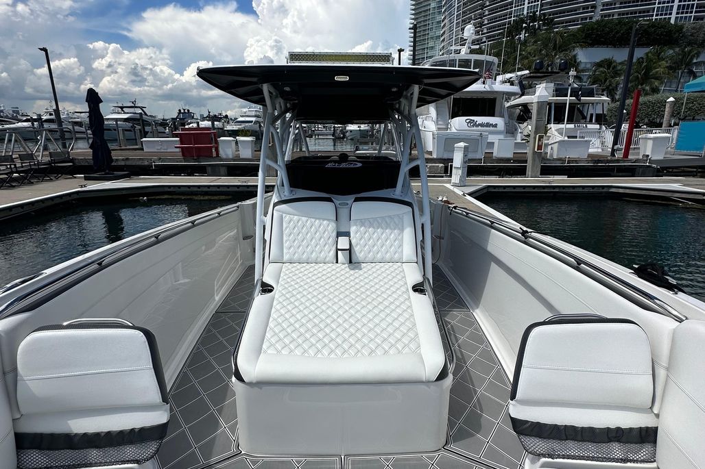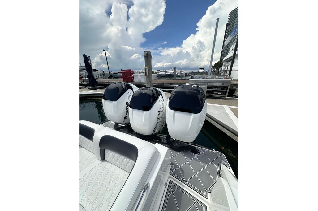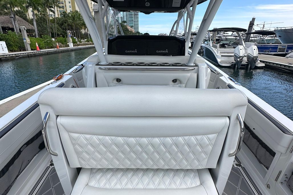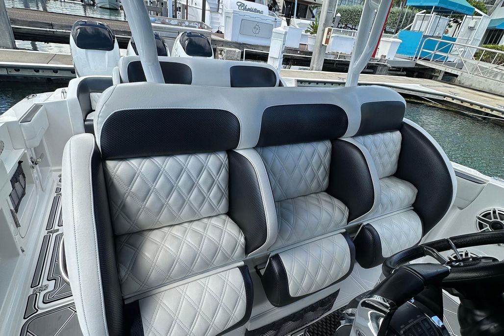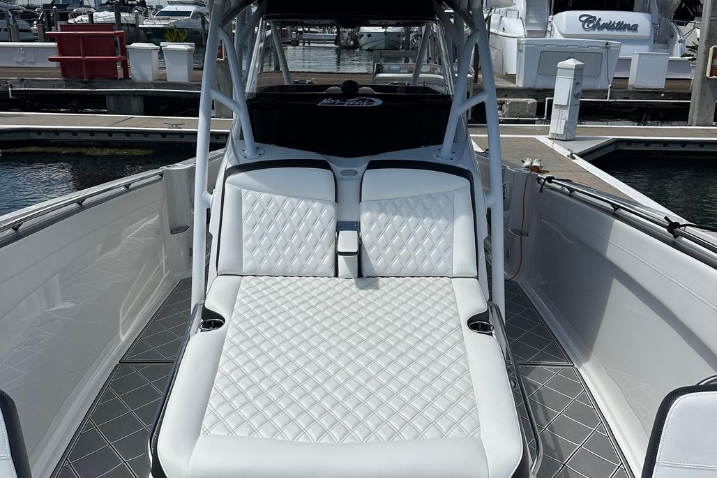 Premium features abound, including dual 22" Garmin navigation displays, an upgraded sound system, a forward sun pad, second-row covered seating, an aft electric sunshade, and a separate cabin complete with a sink and head.