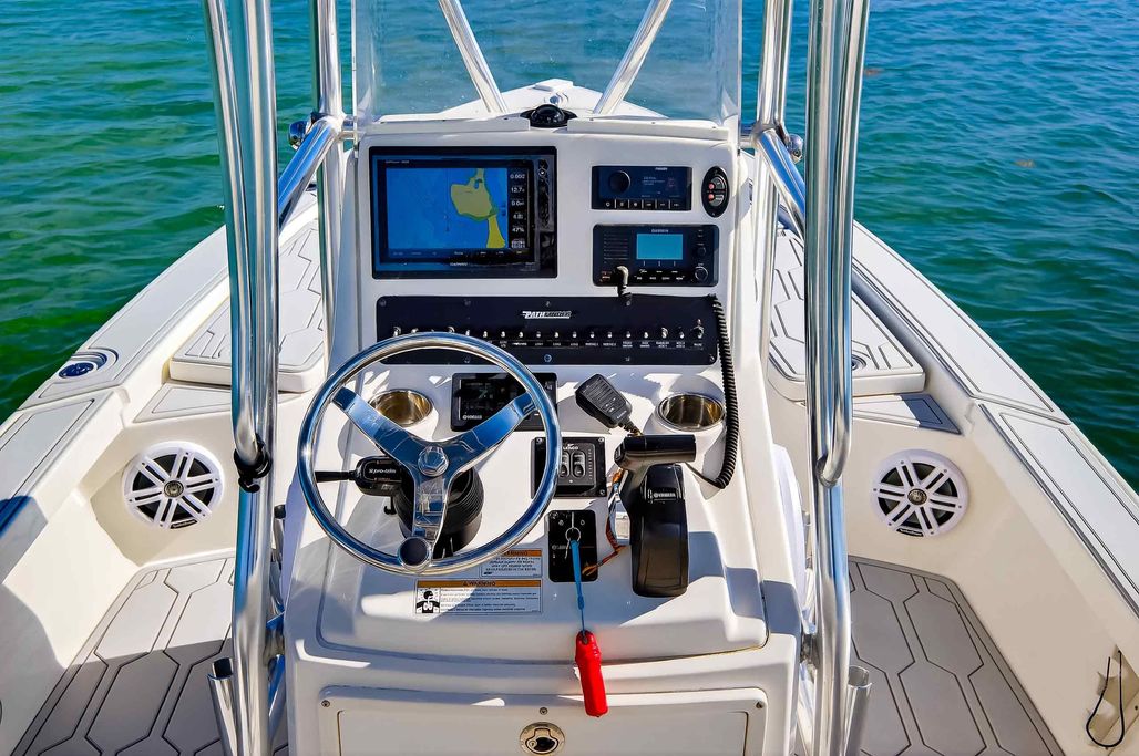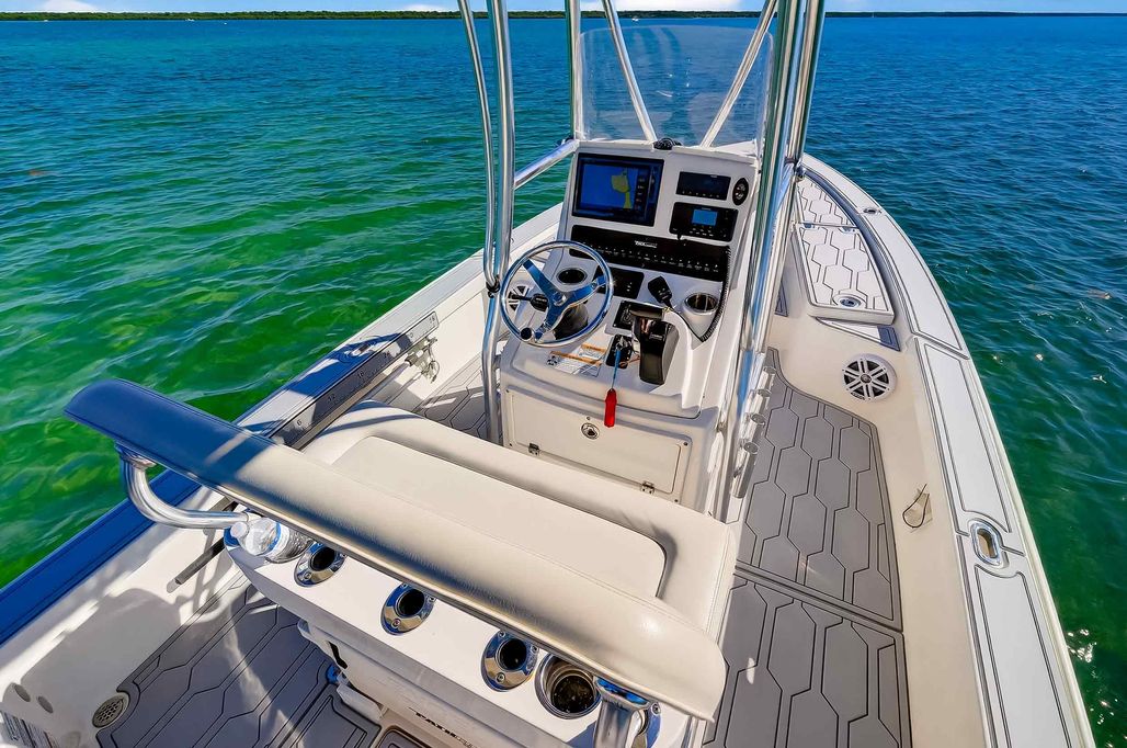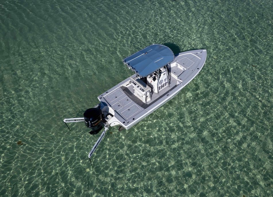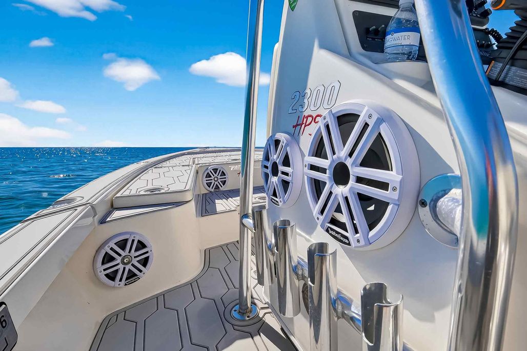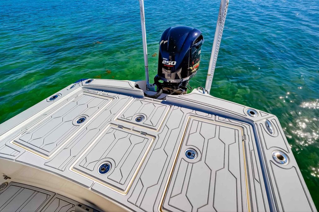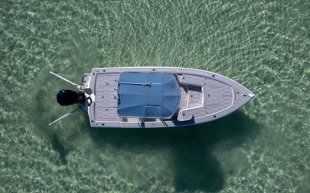 The first bay boat built specifically around Yamaha’s Super High Output (SHO) four-stroke technology, the 2300 HPS (High Performance Step) redefines top-end running performance in a true bay boat platform. A stepped hull and bustle transom with standard 6″ jackplate optimize speed and running efficiency. Add to that more cockpit and deck space, walk around gunwales and increased storage for everything from castnets to 9.5′ fly rods. The result is a jaw-dropping rocket with a light-tackle payload capacity that will clear out your tackle room.