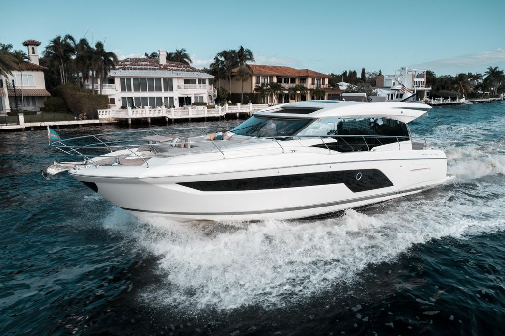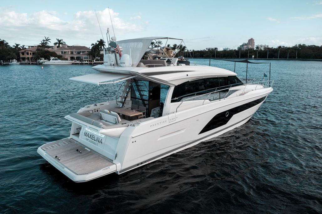 "MAXELINA" is the only Prestige 590S on the market with the extraordinary electric tender garage, which enables you to have 100% of your hydraulic swim platform available for an additional jetski if desired, as well as keep your tender in amazing condition. This Prestige, unlike most, has a flybridge, electric roof (that opens up), salon, and a tender garage