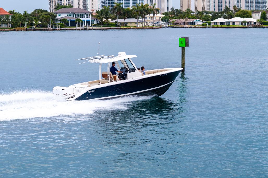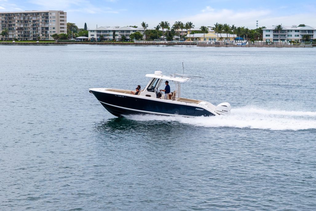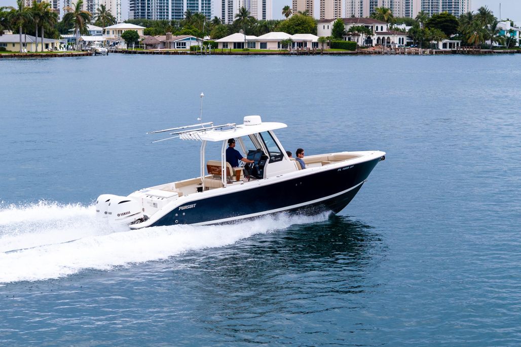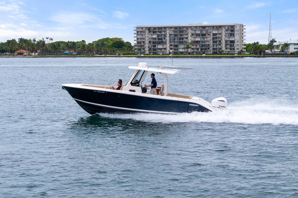 Her versatile layout features forward console and bow seating, teak-accented helm chairs, a fold-down cockpit bench, and a portside dive door for effortless water access. Whether cruising to the Bahamas, enjoying sunset runs, or relaxing at the sandbar, this Pursuit is equipped for it all.