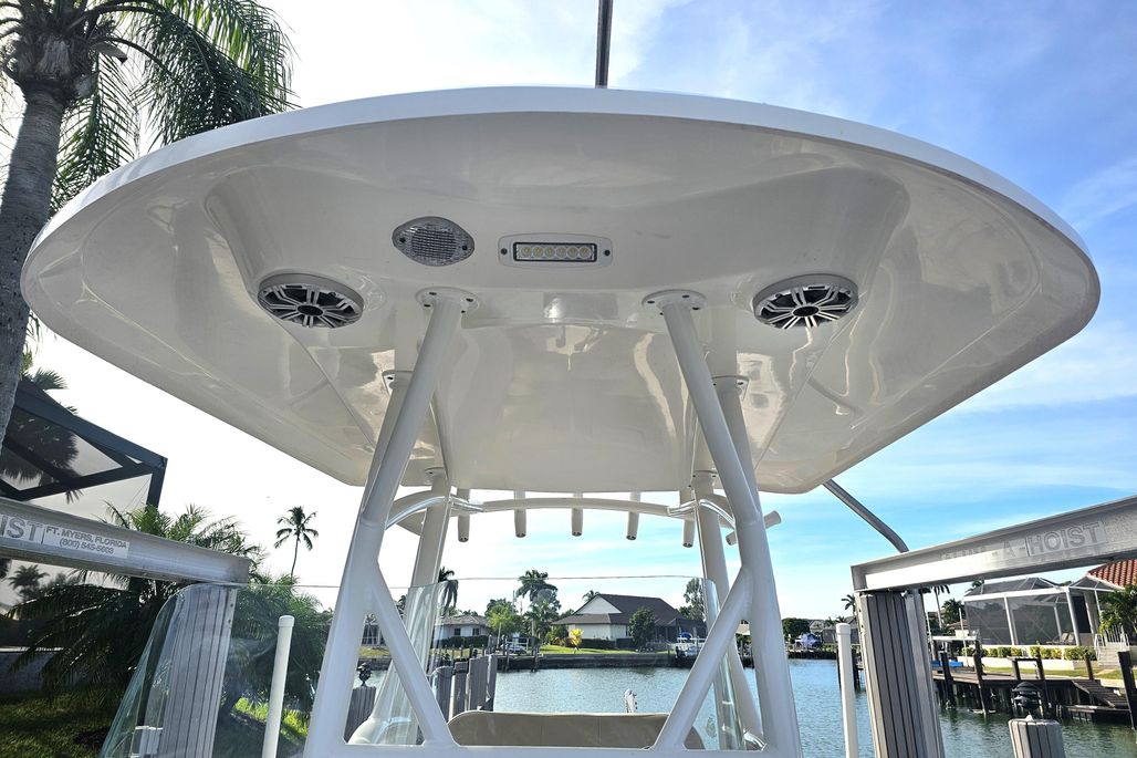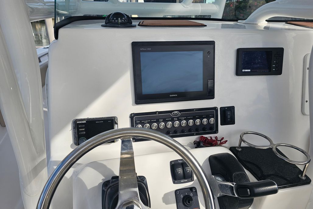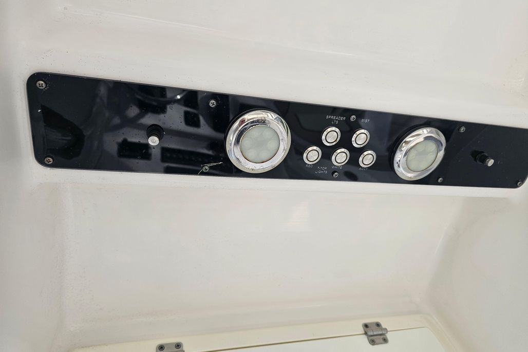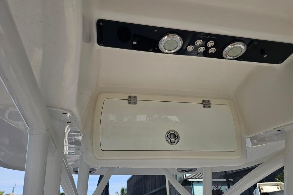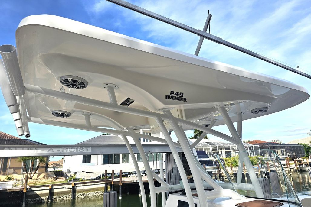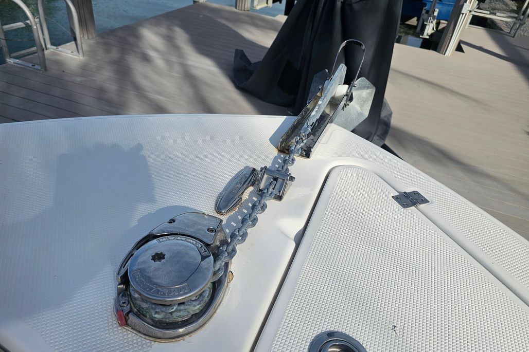 Factory fiberglass t-top, with speakers and LED lighting, Power Pole, Electric anchor windlass, Garmin 7610 XSW GPS/ Fishfinder, VHF Radio, Stereo, Ski Bar, Electric Flush head, Removable Table, Swim Ladder, Yeti cooler and an Igloo cooler for the bow.