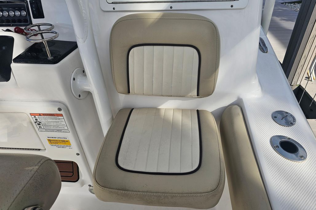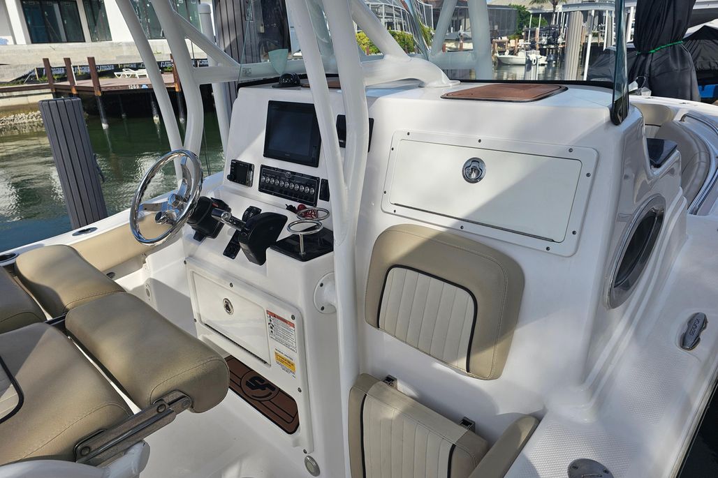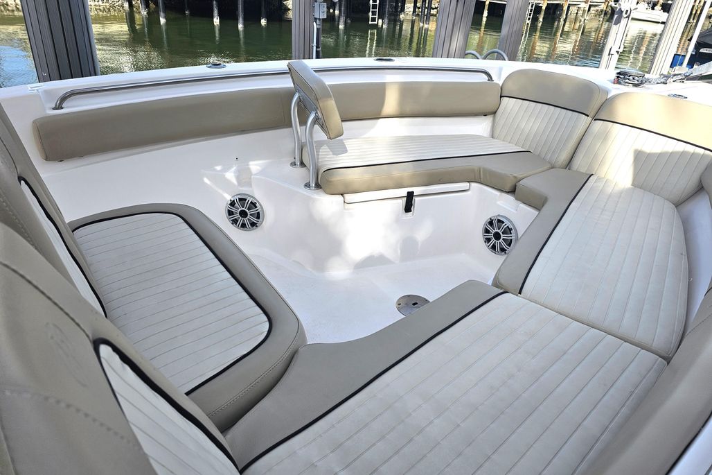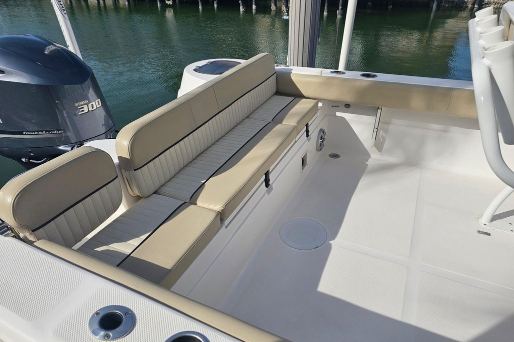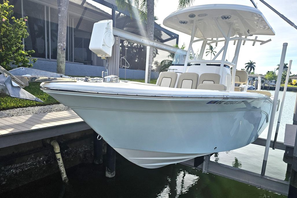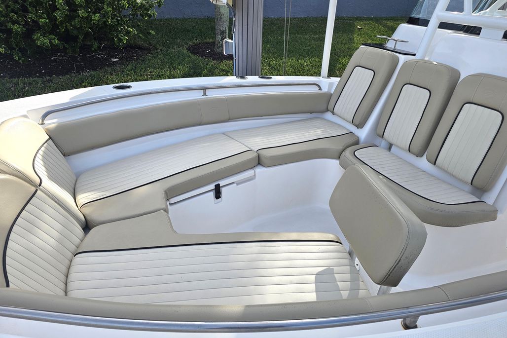 Factory fiberglass t-top, with speakers and LED lighting, Power Pole, Electric anchor windlass, Garmin 7610 XSW GPS/ Fishfinder, VHF Radio, Stereo, Ski Bar, Electric Flush head, Removable Table, Swim Ladder, Yeti cooler and an Igloo cooler for the bow.