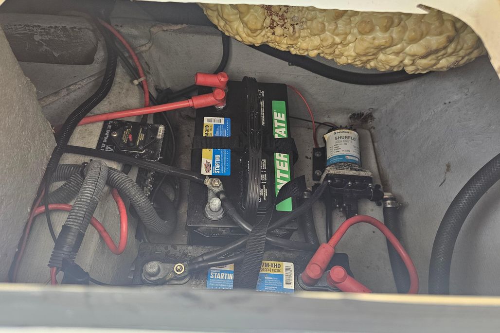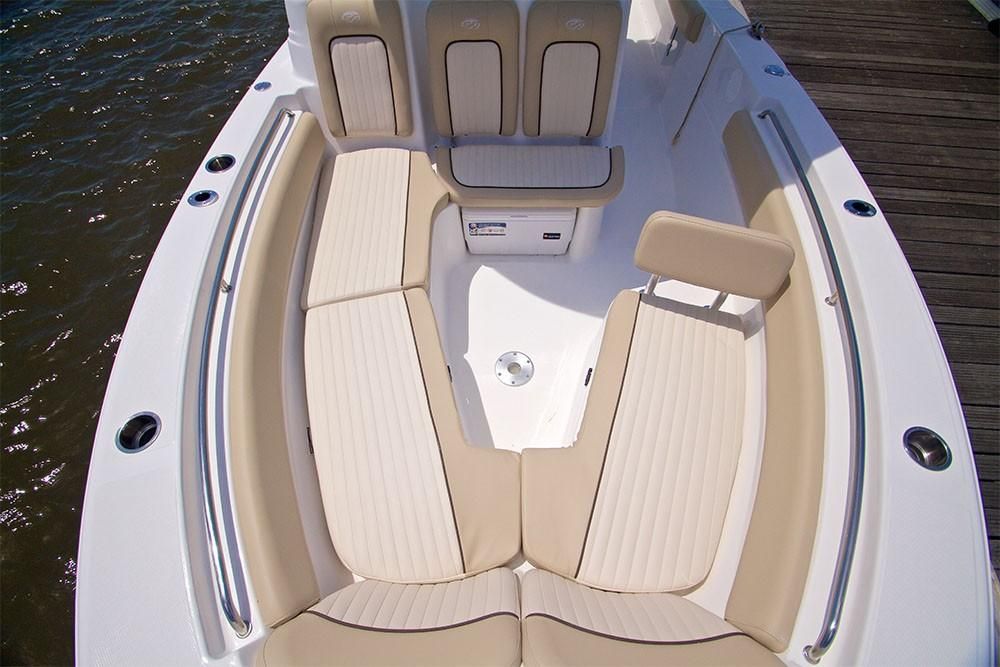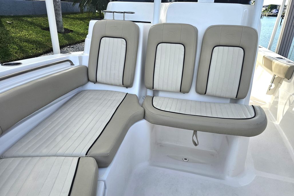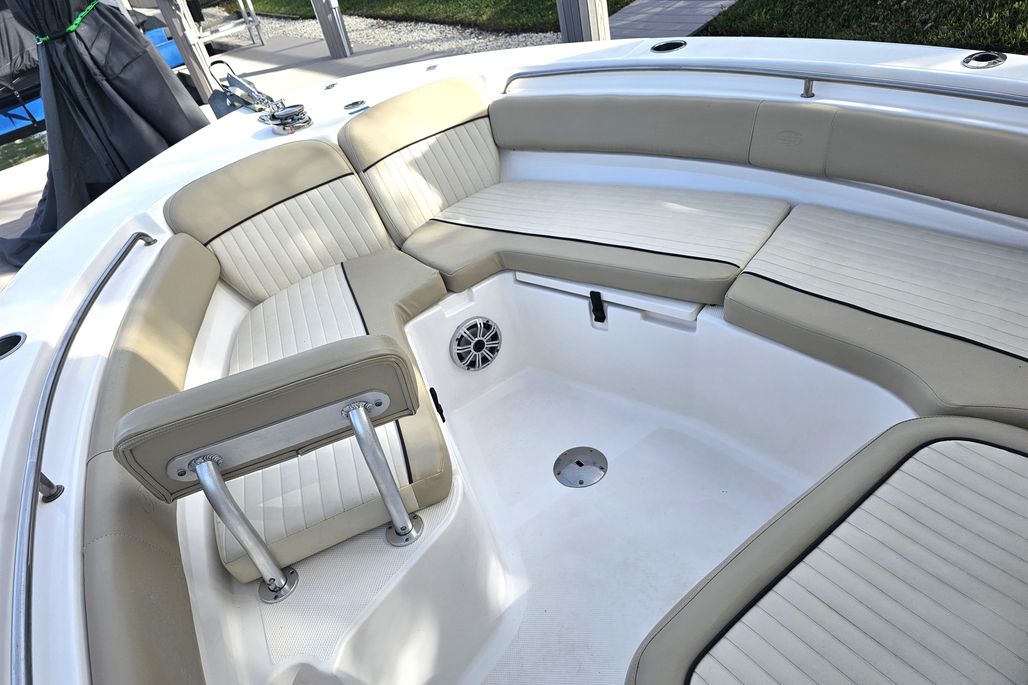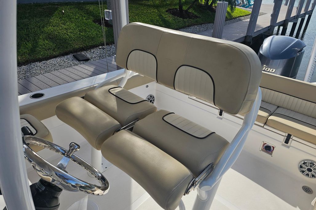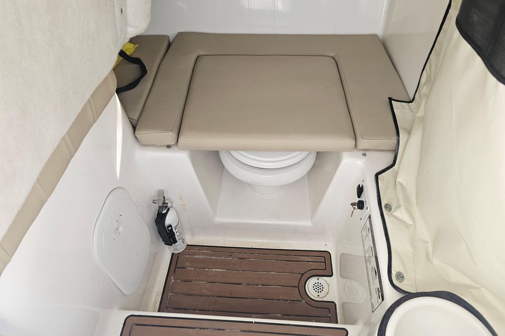 Factory fiberglass t-top, with speakers and LED lighting, Power Pole, Electric anchor windlass, Garmin 7610 XSW GPS/ Fishfinder, VHF Radio, Stereo, Ski Bar, Electric Flush head, Removable Table, Swim Ladder, Yeti cooler and an Igloo cooler for the bow.