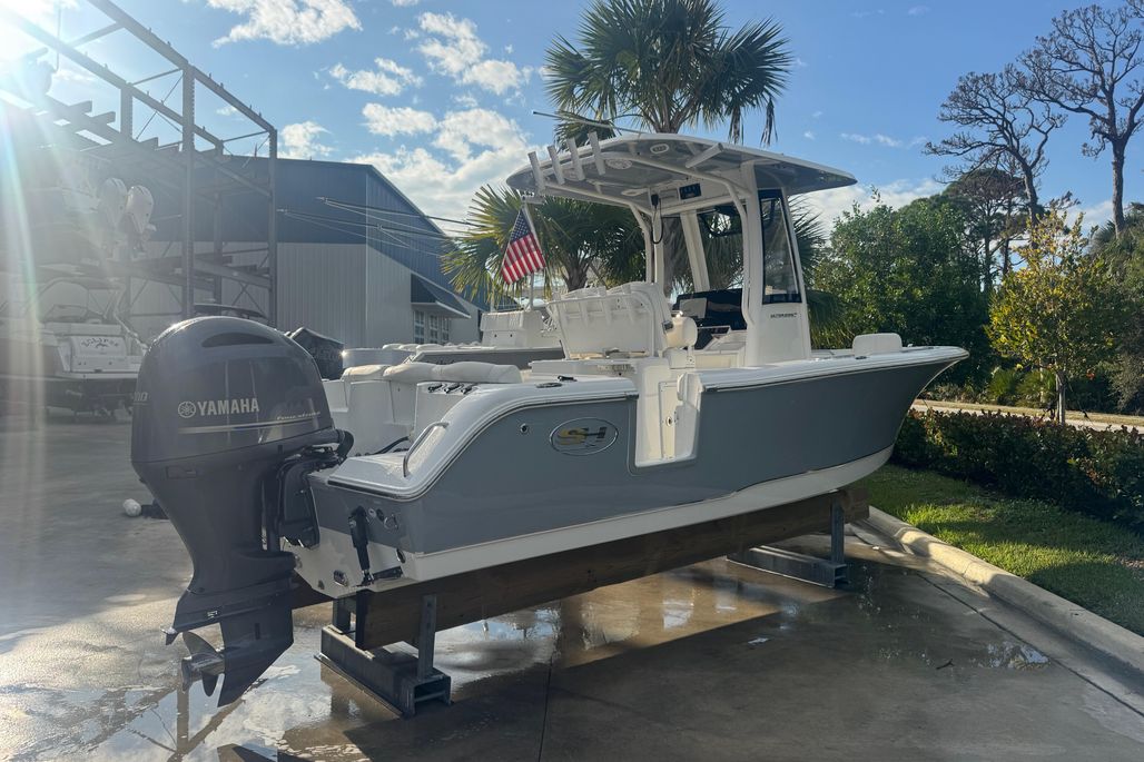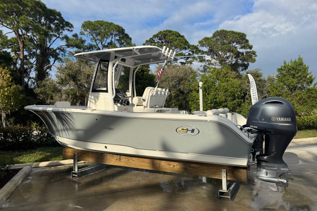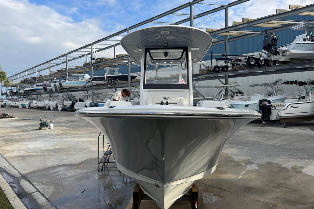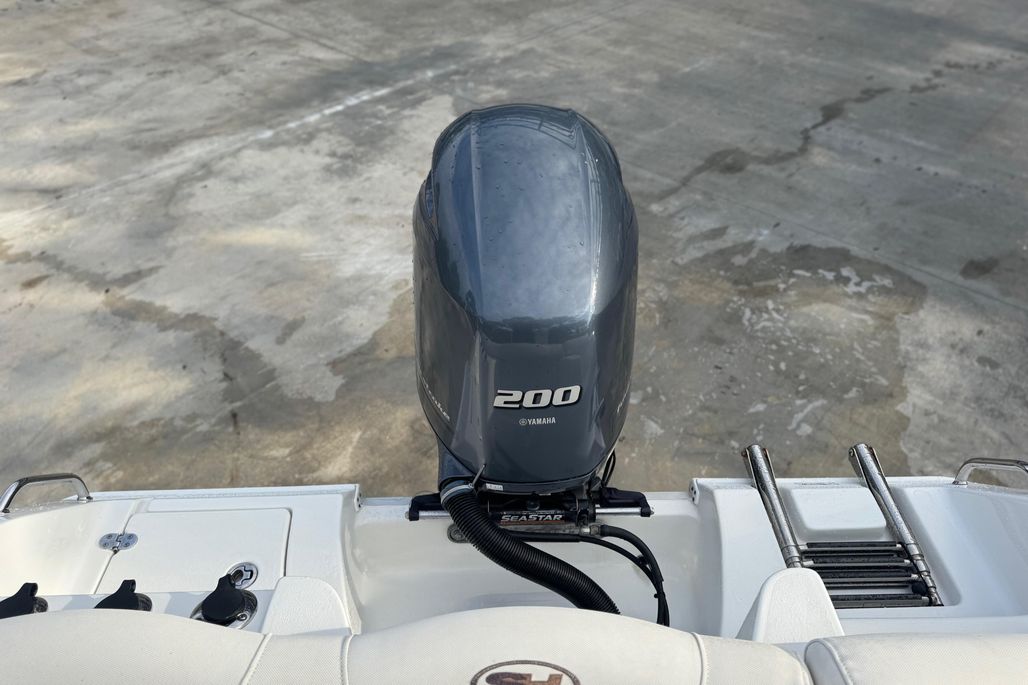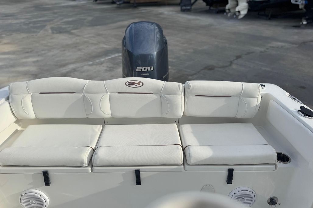 The 2019 Sea Hunt Ultra 235 SE is a 23'7" family-friendly center console (8'6" beam, about 3,800 lb dry weight) powered by 200 hp Yamaha outboard on a deep-V hull with sharp entry and pronounced bow flare for a dry, confident ride. It carries 96 gallons of fuel and roughly 10–15 gallons of freshwater, offers seating for about 8–10, and combines serious fishing capability with sandbar and cruising comfort.