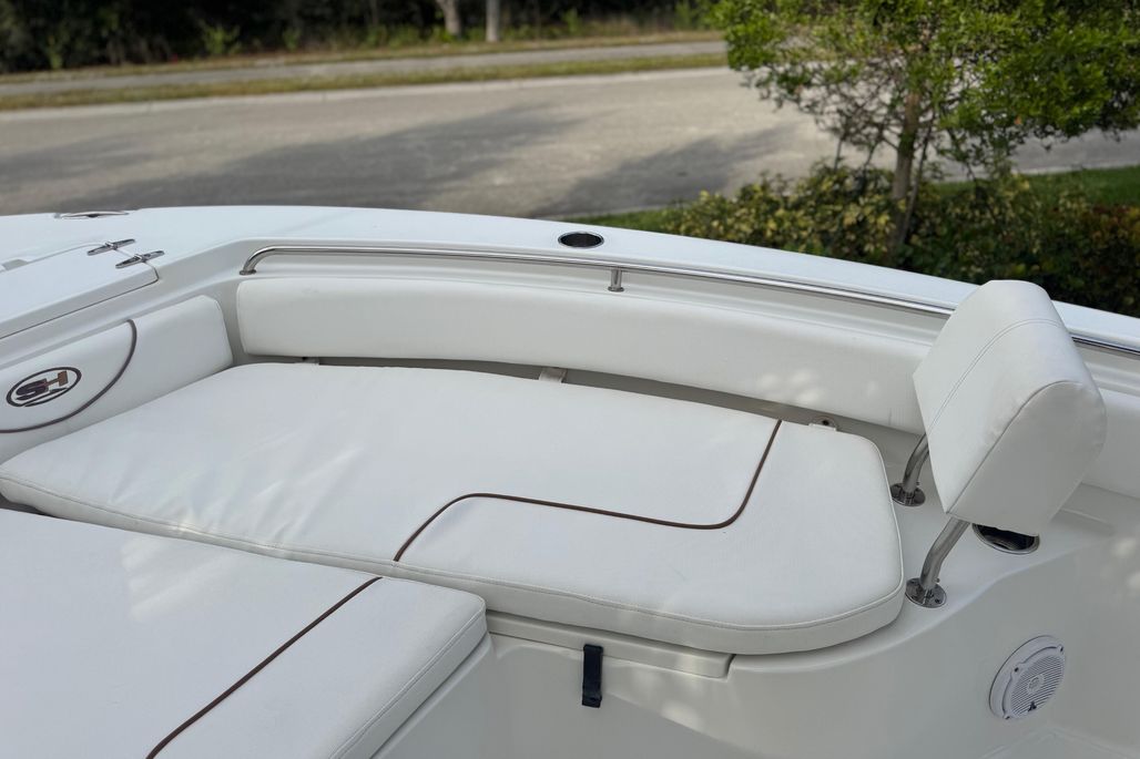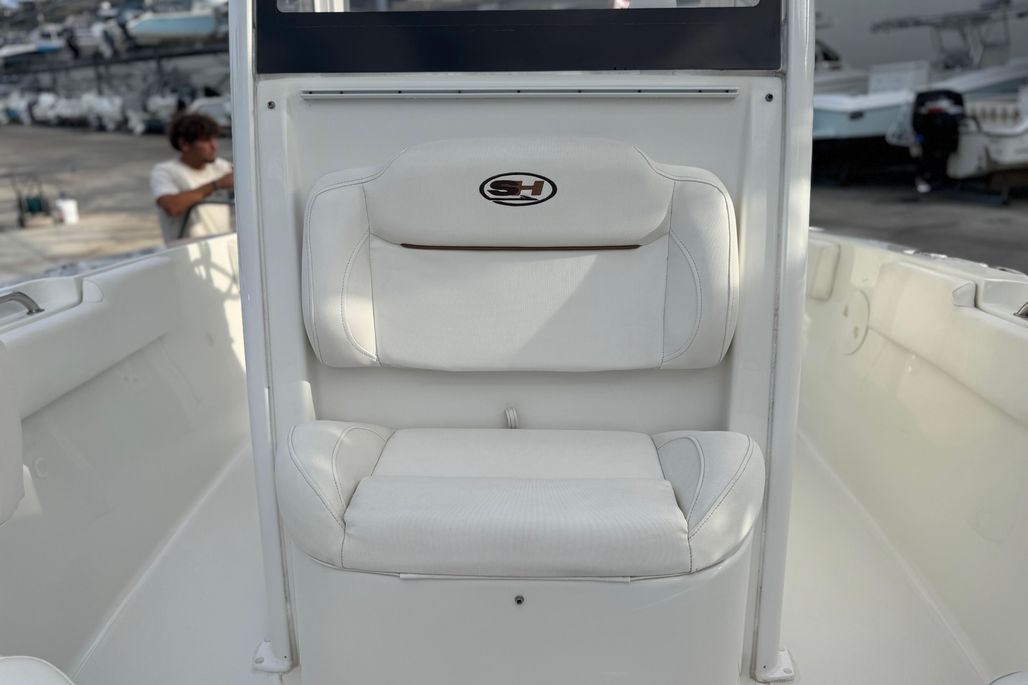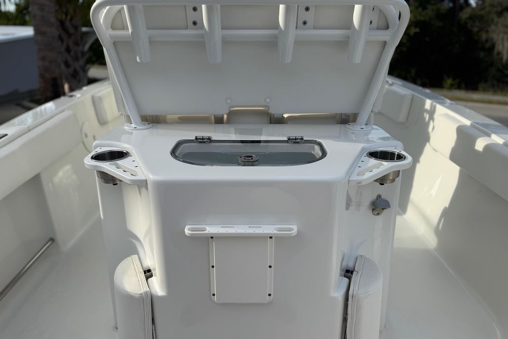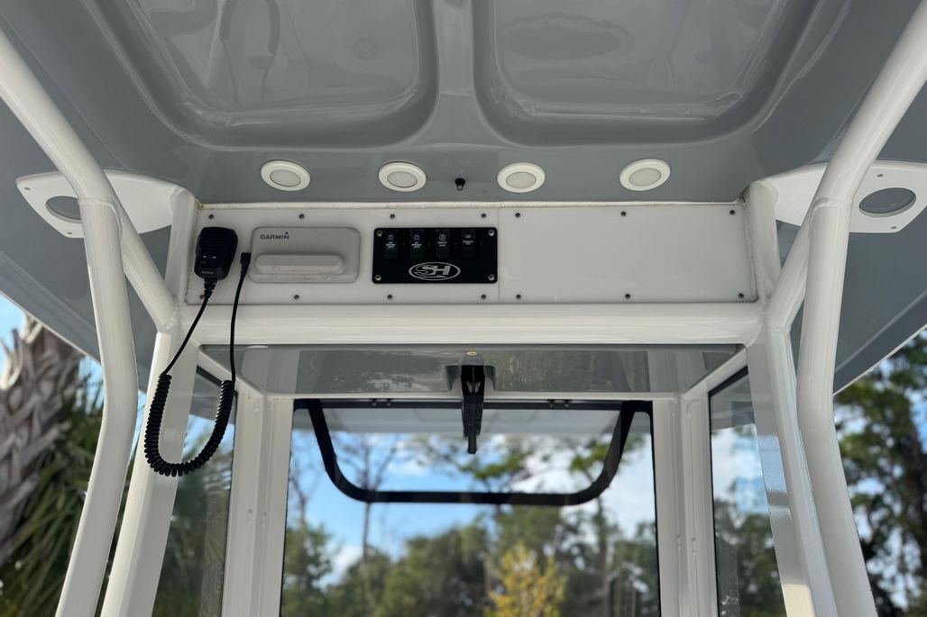The helm typically features a leaning post with bolsters and footrest, hydraulic steering, trim tabs with auto-retract, a large flush-mount area for a multi-function display (often a 12" Garmin), VHF, Bluetooth stereo with multiple speakers, and lighted compass. Overhead, most are equipped with a powder-coated fiberglass T-top with integrated LED spreader and courtesy lights, electronics box, misters on “SE/Special Edition” style packages, and kingfish rod holders, rounding out a turnkey platform that works equally well offshore, inshore, or on family cruising days.