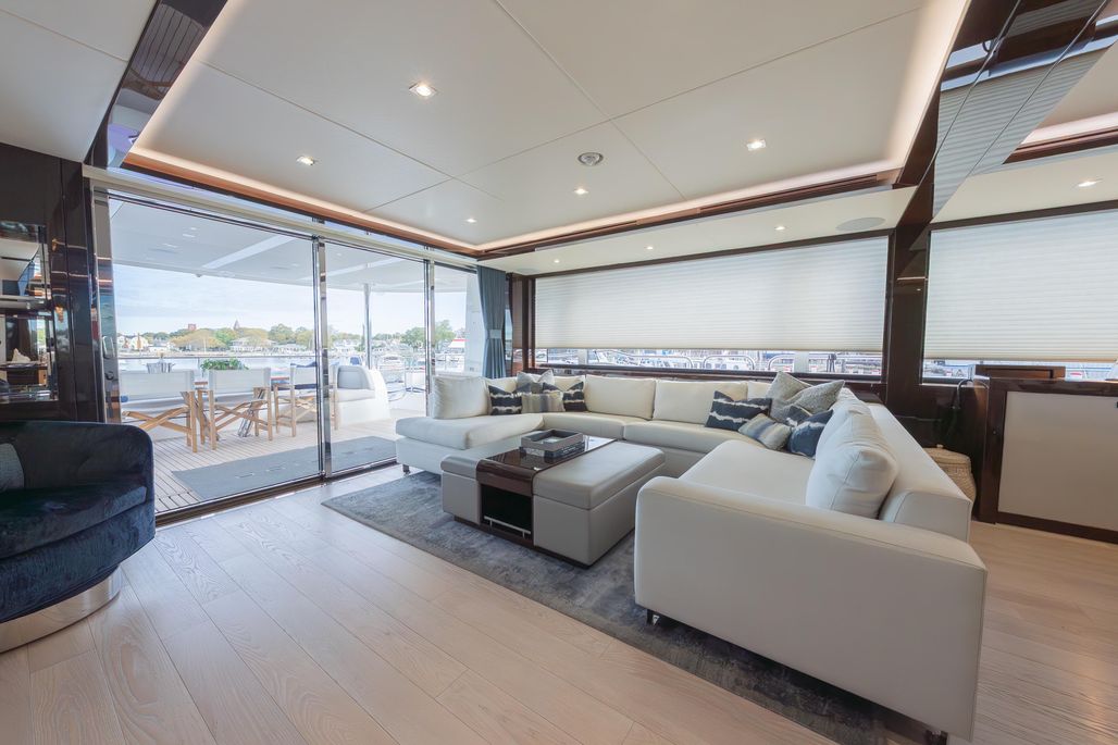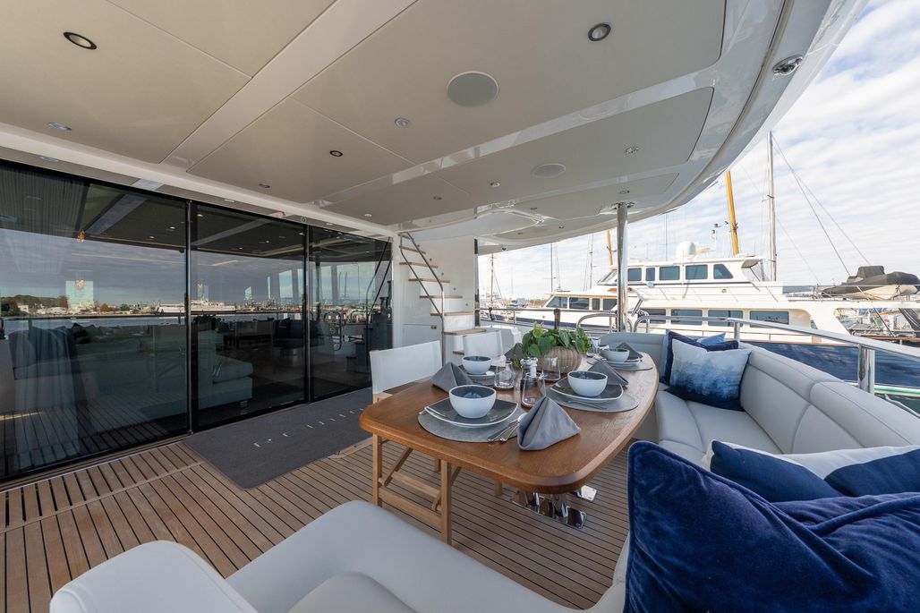 Above deck, the flybridge serves as the yacht's social hub, featuring expansive areas for dining and lounging. A custom wet bar is outfitted with premium amenities, including a refrigerator, ice maker, and grill, ideal for hosting gatherings. Additionally, the aft deck lounge with a coffee table offers a more intimate space for relaxation. The hardtop sunroof and retractable sunshade canopy provide the flexibility to enjoy open skies or cool shade, creating the perfect setting for entertaining or unwinding while taking in sweeping, panoramic views.