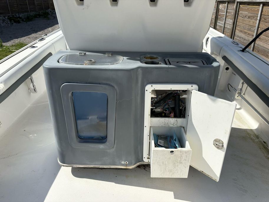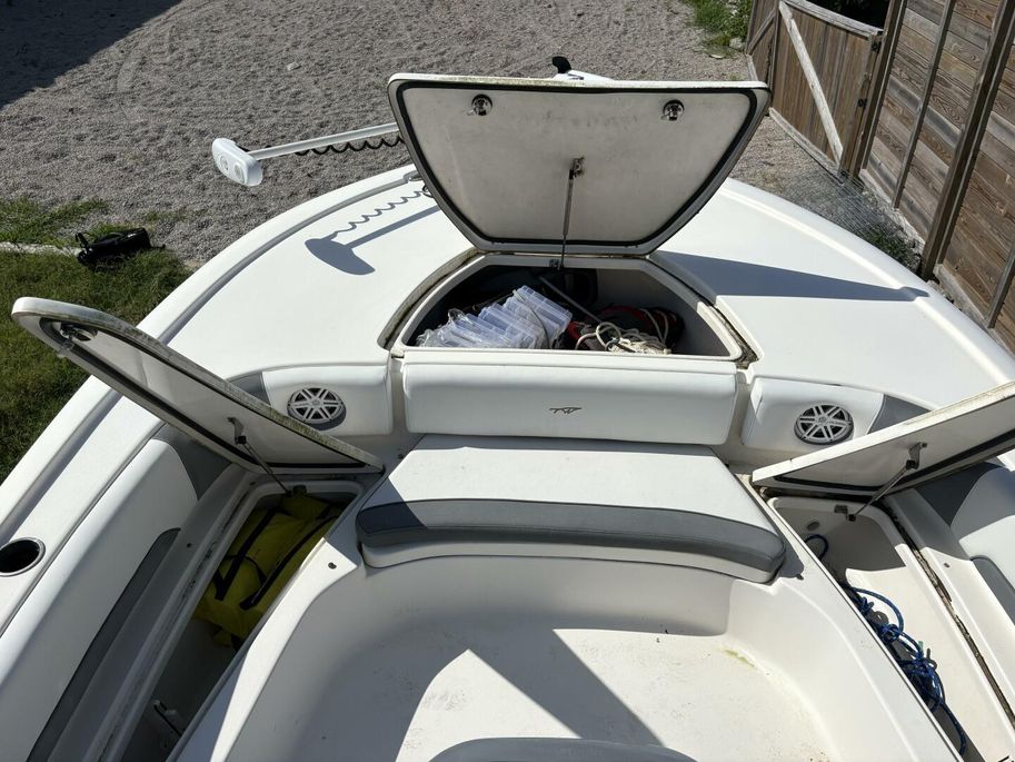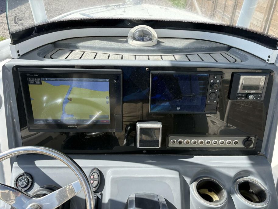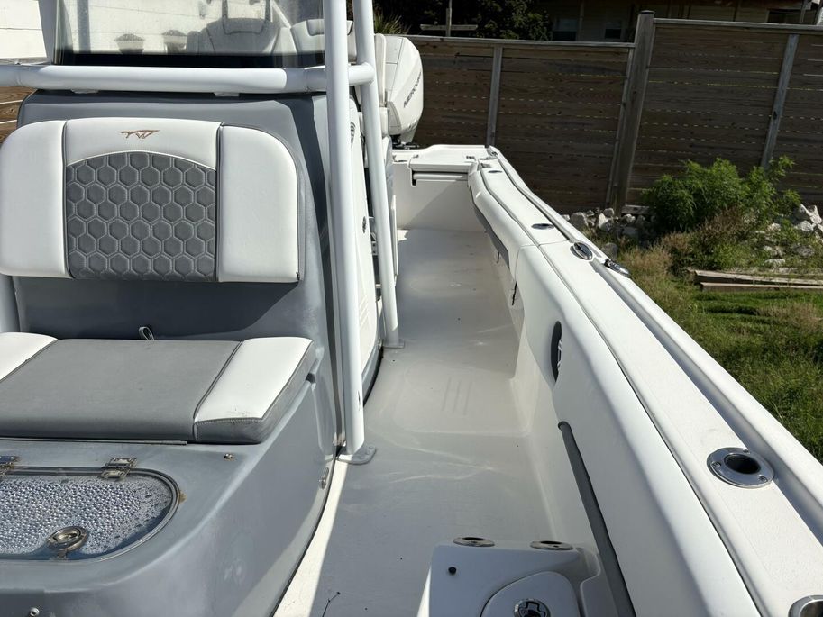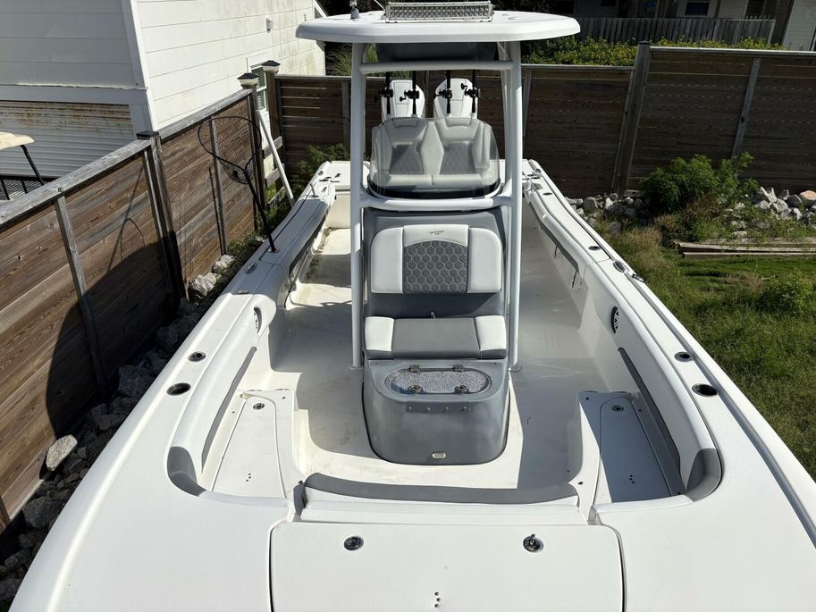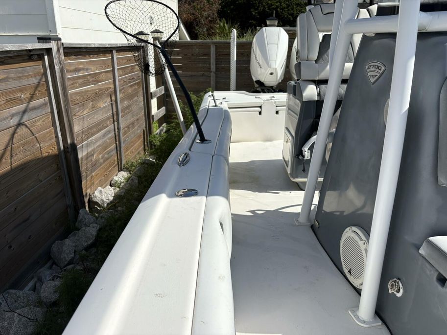 At the helm, a premium Garmin chartplotter provides advanced navigation and sonar capabilities, ensuring safe and confident exploration of both familiar and uncharted waters. The expansive, ergonomically designed deck layout offers abundant casting space, deep storage compartments, insulated fish boxes, and multiple livewells, all configured to maximize fishing efficiency without sacrificing comfort. The 2700 Carolina Bay's wide beam and stepped hull design provide an exceptionally smooth and stable ride, even in choppier conditions, while the integrated seating, fold-down jump seats, and forward lounge area create a welcoming environment for family cruising or entertaining.
