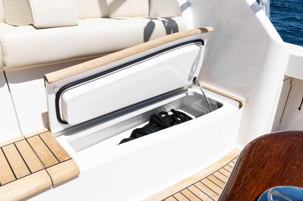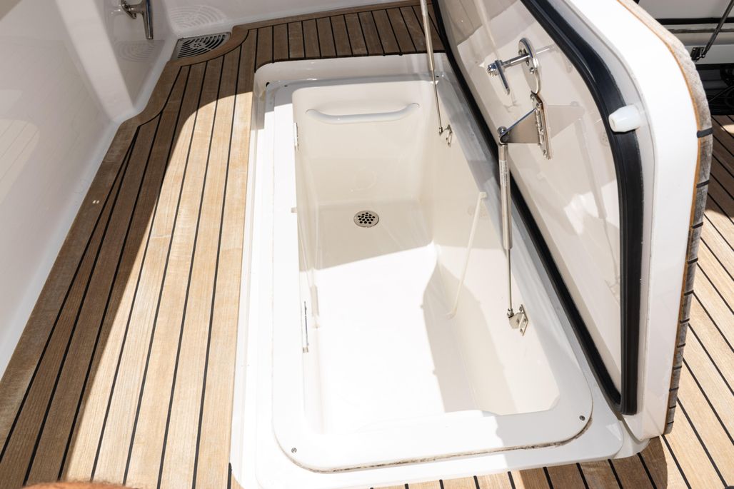 With a 16'4" beam—the widest in its class—the salon offers an inviting, open layout ideal for relaxing and entertaining. A 28-inch flat-screen TV and multi-directional stereo system enhance onboard comfort.