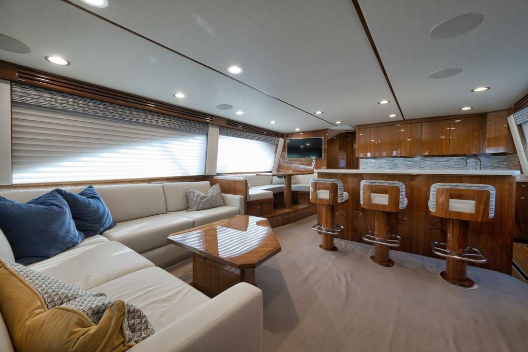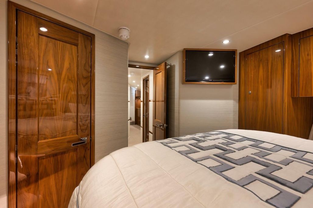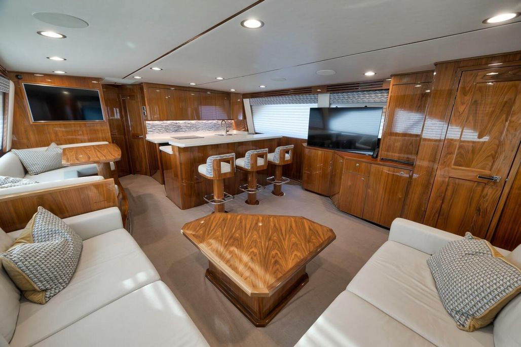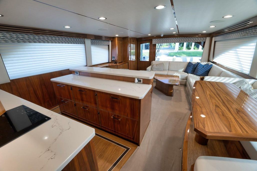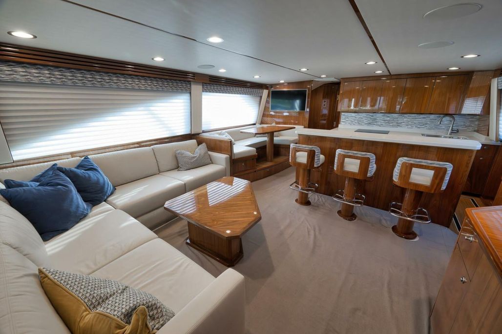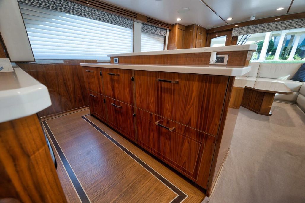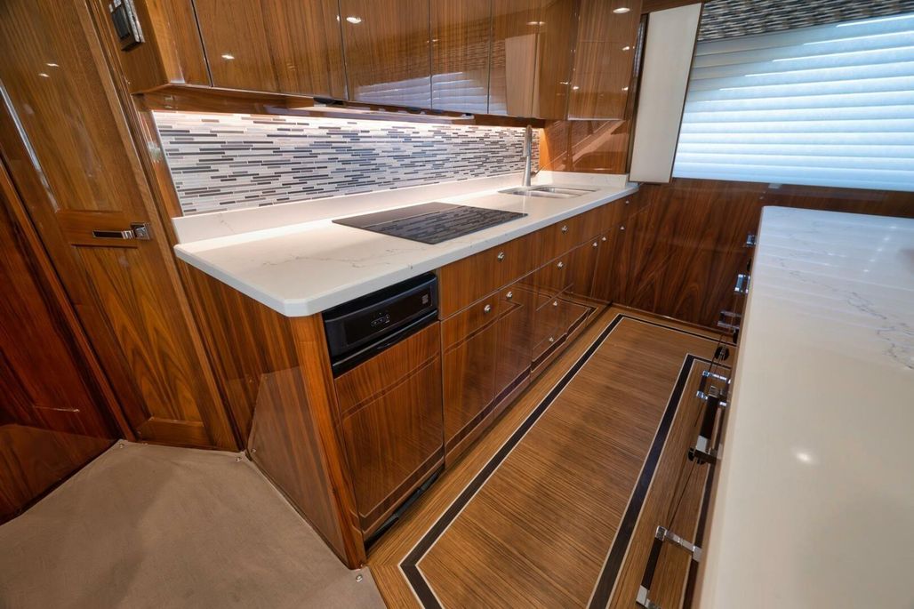 2019 68' Viking Convertible "Galati Yacht Sales Incoming Trade" for sale- She encompasses a truly exceptional build, dialed in to the highest degree. Very well maintained from both an aesthetic and mechanical perspective. The 68 offers a spectacular 4-stateroom, 4.5-head layout, coupled with a smooth, quiet, and dry ride. Propelled with proven MTU 12V 2000 M96Ls, She offers a comfortable 34-knot cruise and a 40-knot barrier top end. Other than the ’68’s stellar performance, the true attraction of this vessel lies within its spacious salon with raised dinette and open galley island arrangement. View the pop-up TV on a mechanical lift to starboard from any vantage point, or the second additional TV mounted forward above the dinette. The large and spacious walk-in pantry forward of the galley is a game-changer and sure to please those looking for convenient access to organized storage space. Just forward down the companionway from the pantry, you will find easy access to the generous crew’s quarters with a second Octoplex control and access to the engine room.