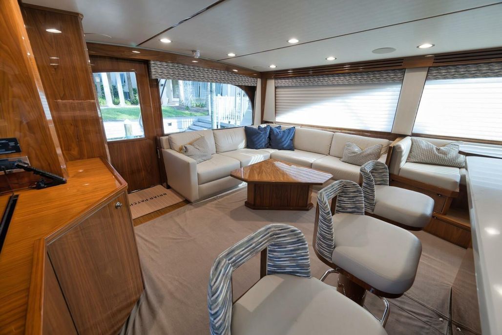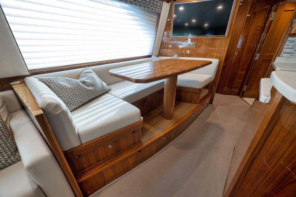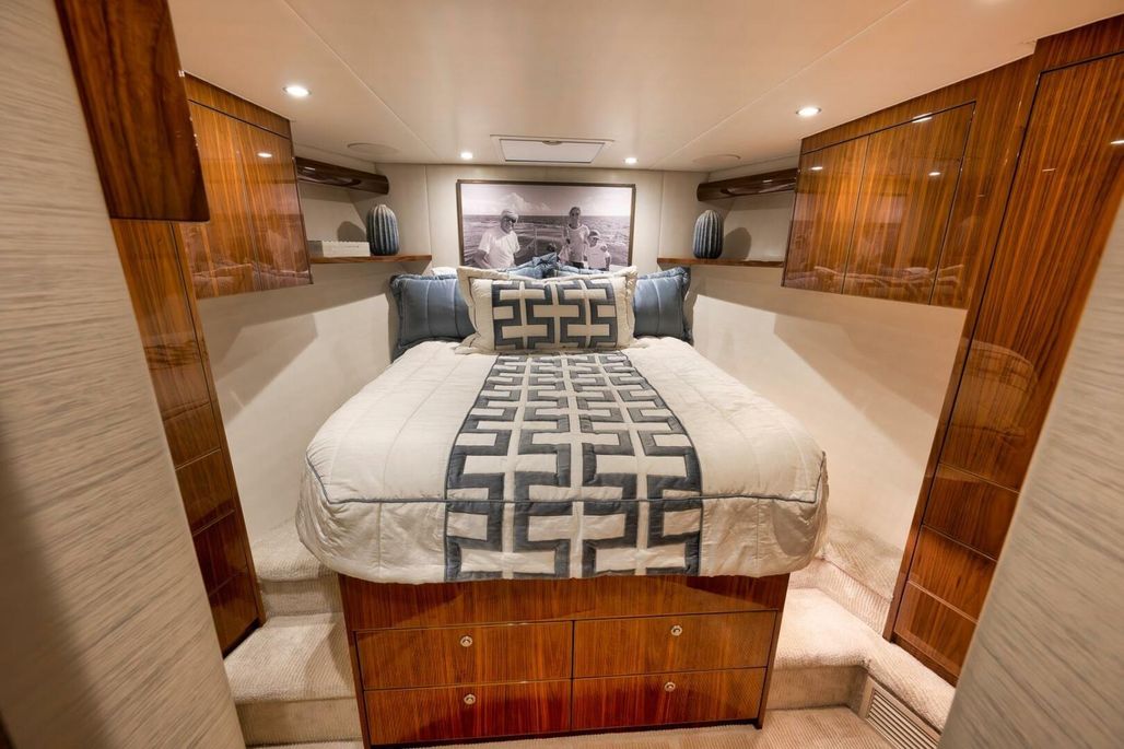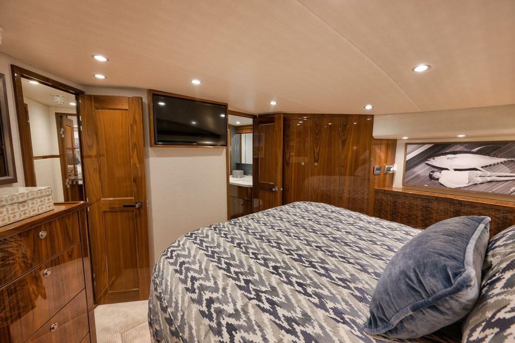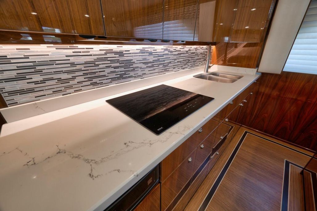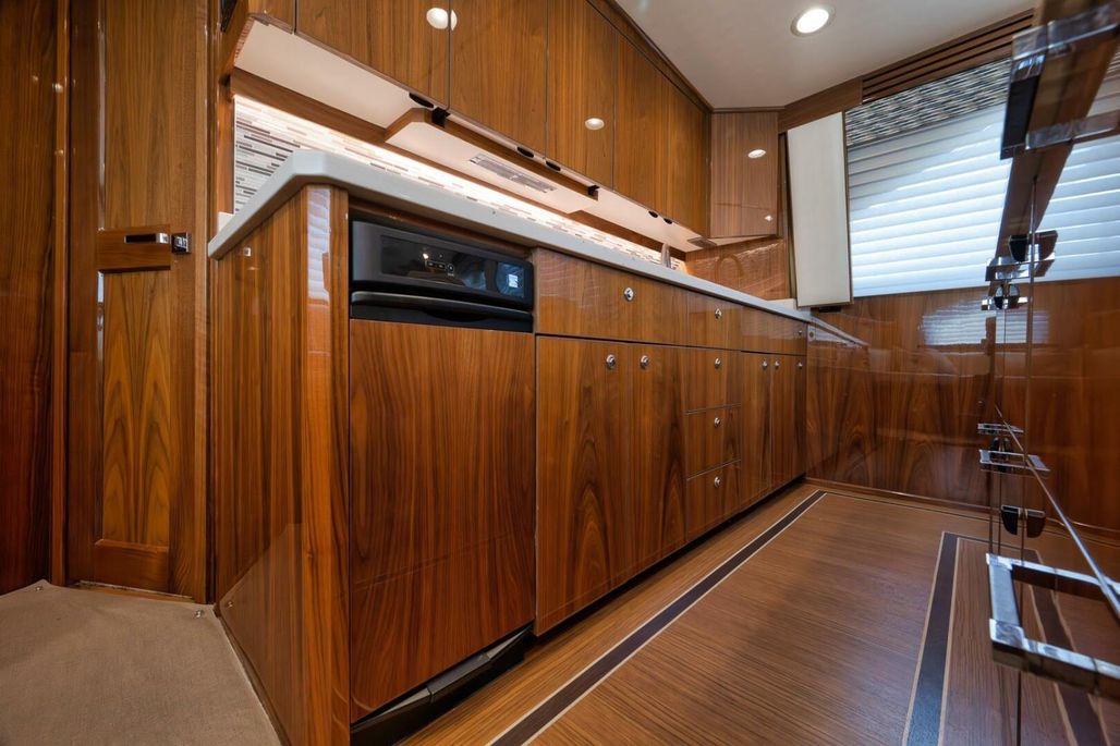 2019 68' Viking Convertible "Galati Yacht Sales Incoming Trade" for sale- She encompasses a truly exceptional build, dialed in to the highest degree. Very well maintained from both an aesthetic and mechanical perspective. The 68 offers a spectacular 4-stateroom, 4.5-head layout, coupled with a smooth, quiet, and dry ride. Propelled with proven MTU 12V 2000 M96Ls, She offers a comfortable 34-knot cruise and a 40-knot barrier top end. Other than the ’68’s stellar performance, the true attraction of this vessel lies within its spacious salon with raised dinette and open galley island arrangement. View the pop-up TV on a mechanical lift to starboard from any vantage point, or the second additional TV mounted forward above the dinette. The large and spacious walk-in pantry forward of the galley is a game-changer and sure to please those looking for convenient access to organized storage space. Just forward down the companionway from the pantry, you will find easy access to the generous crew’s quarters with a second Octoplex control and access to the engine room.