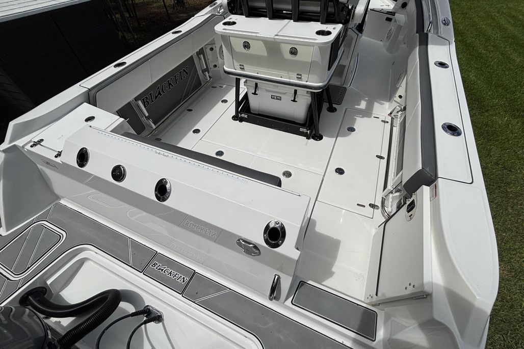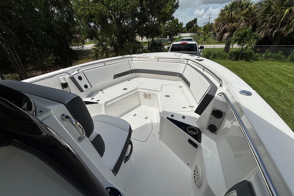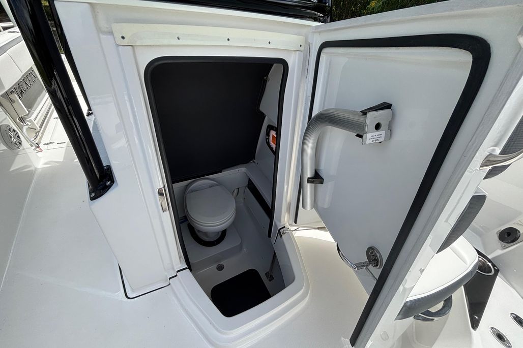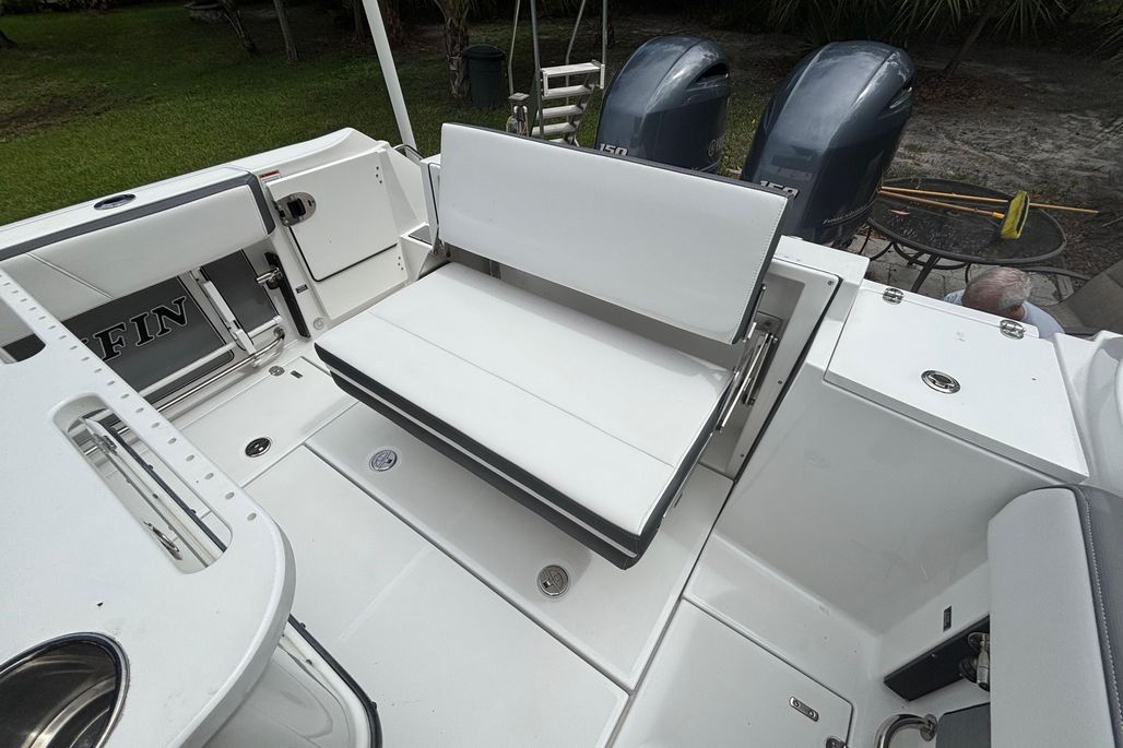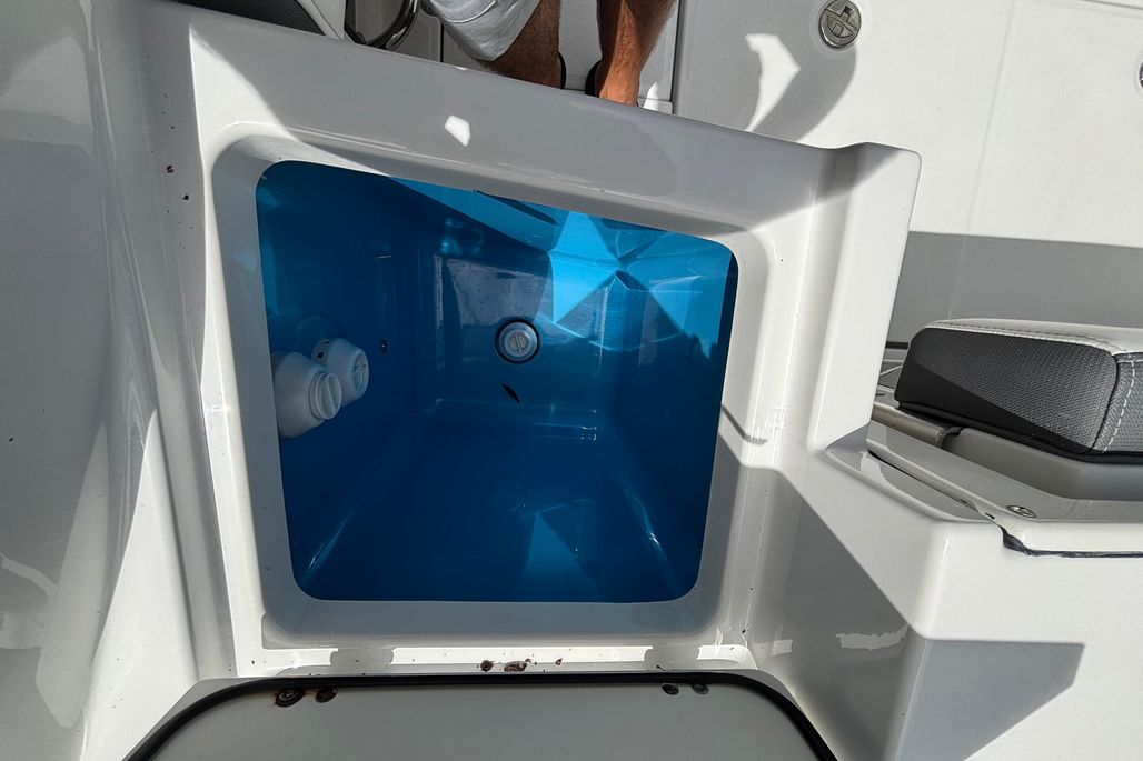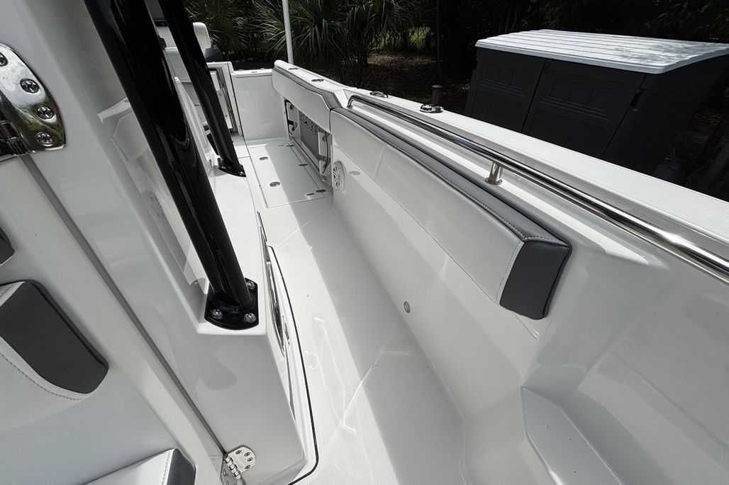 Fishing equipment included items like a 24-gallon insulated baitwell, a bait prep station, two insulated in-floor fish boxes, and multiple rod holders. Hull and deck features included a fiberglass hardtop with a windshield and wiper, stainless steel cleats and eyes, a transom walk-thru door, an integrated swim platform with a ladder, and anchor storage. For comfort and seating, the boat featured U-shaped bow seating, a forward console seat, helm seats with bolsters and armrests, transom foldaway seating, and a head compartment with a Porta Potti. Mechanical and electrical components included an automatic bilge pump, power-assisted steering, a digital engine monitoring system, a Fusion stereo with JL speakers and amplifier, and USB outlets.Jupiter Marine Sales: Jupiter is pleased to assist you in the purchase of this vessel. This boat is centrally listed by Top Knotch Yachts.