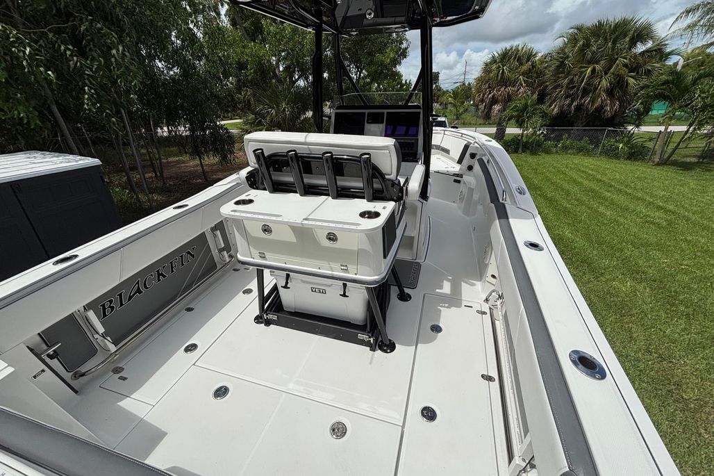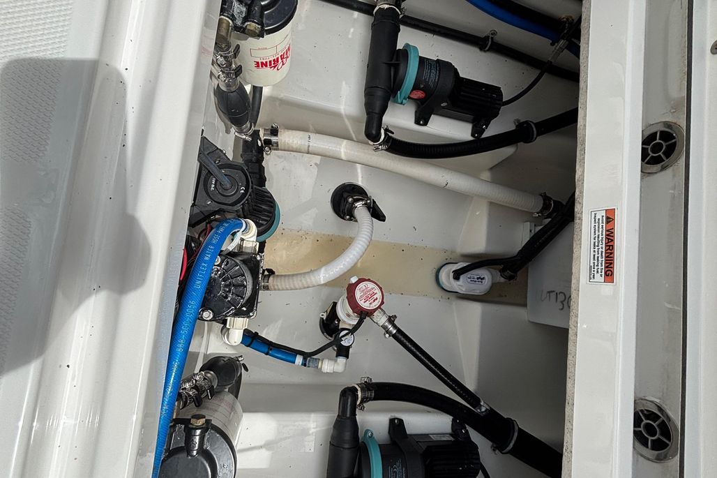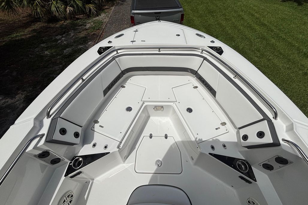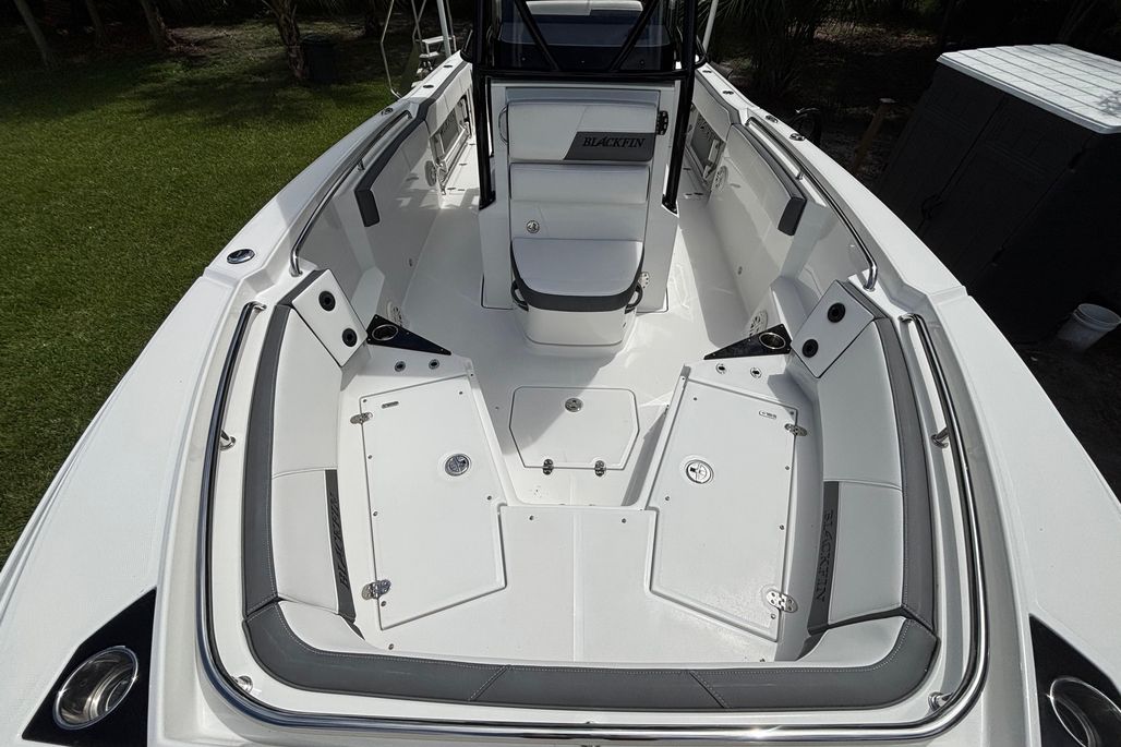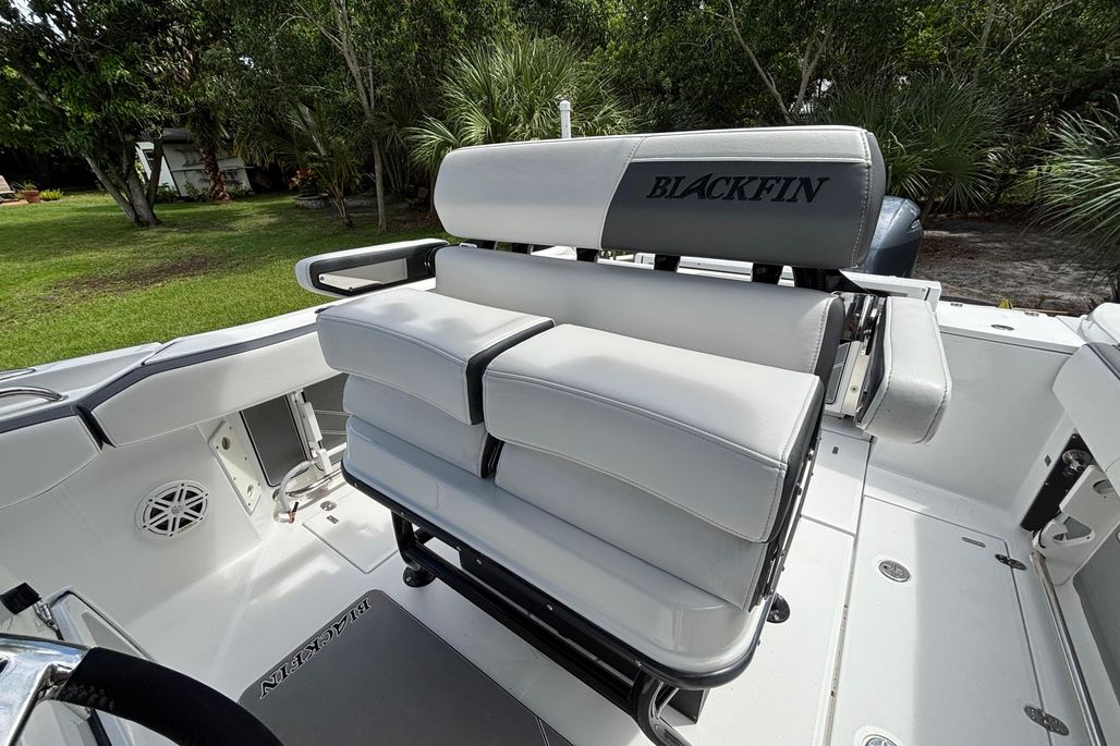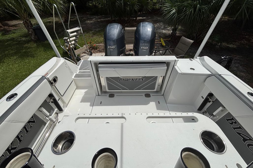 Fishing equipment included items like a 24-gallon insulated baitwell, a bait prep station, two insulated in-floor fish boxes, and multiple rod holders. Hull and deck features included a fiberglass hardtop with a windshield and wiper, stainless steel cleats and eyes, a transom walk-thru door, an integrated swim platform with a ladder, and anchor storage. For comfort and seating, the boat featured U-shaped bow seating, a forward console seat, helm seats with bolsters and armrests, transom foldaway seating, and a head compartment with a Porta Potti. Mechanical and electrical components included an automatic bilge pump, power-assisted steering, a digital engine monitoring system, a Fusion stereo with JL speakers and amplifier, and USB outlets.Jupiter Marine Sales: Jupiter is pleased to assist you in the purchase of this vessel. This boat is centrally listed by Top Knotch Yachts.