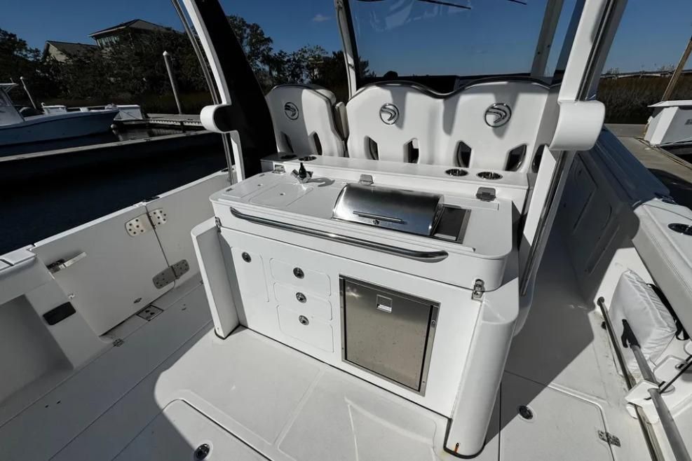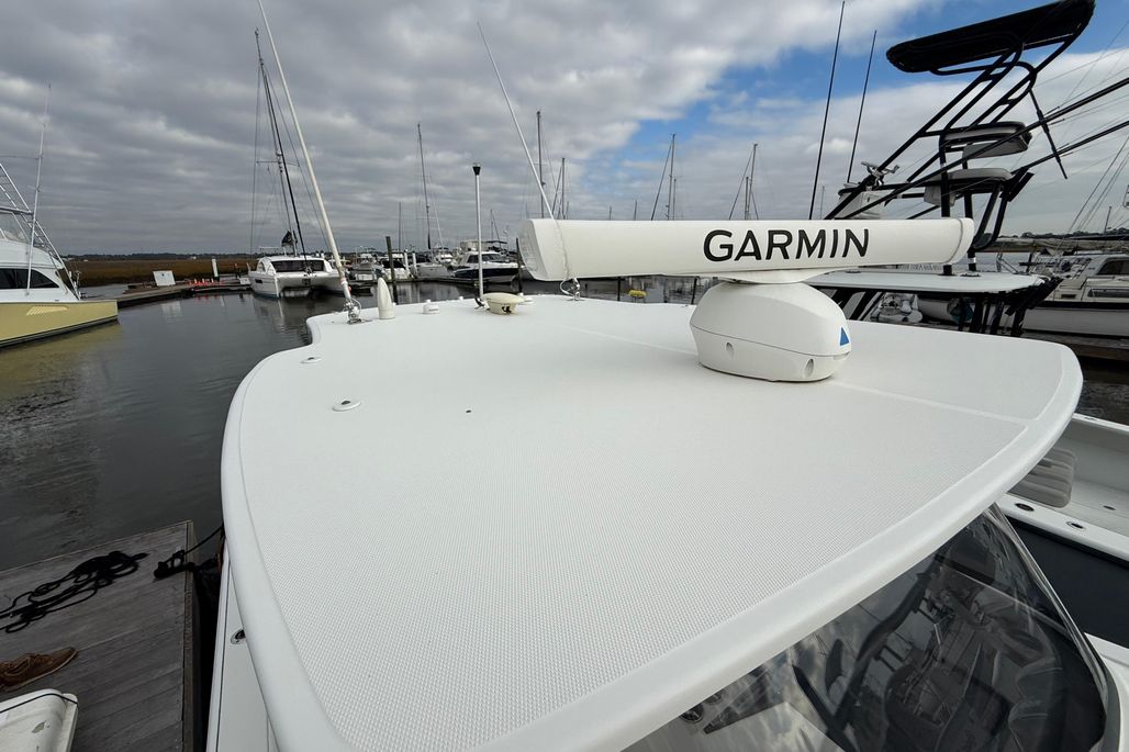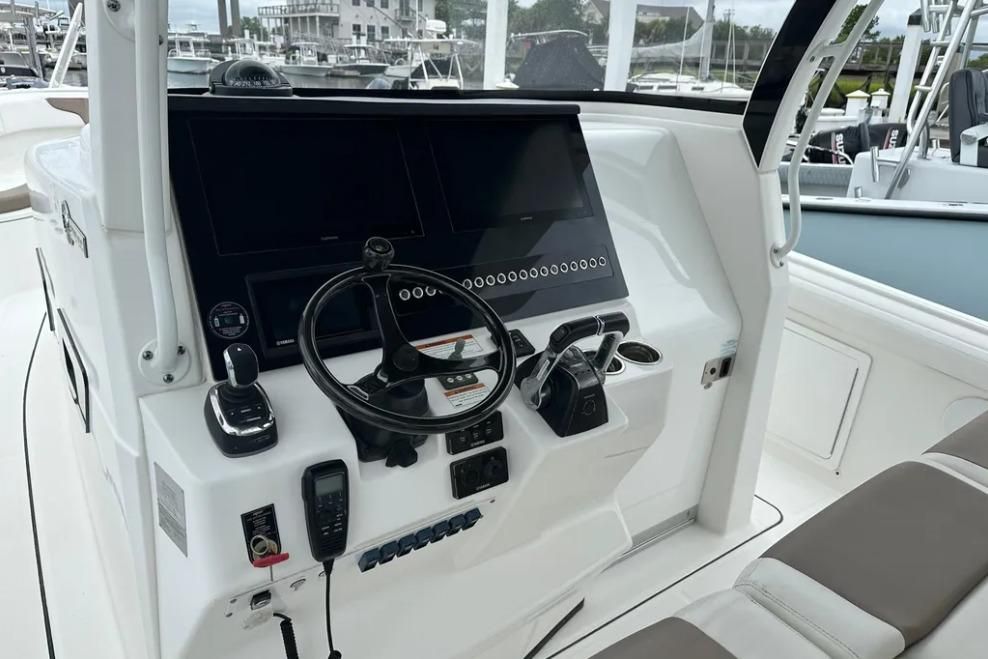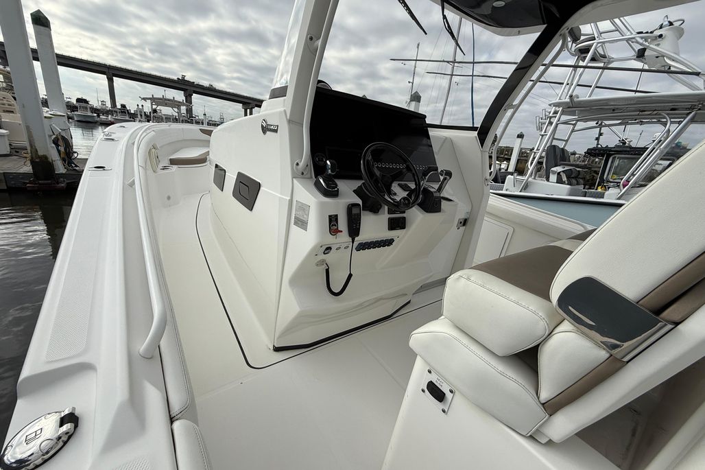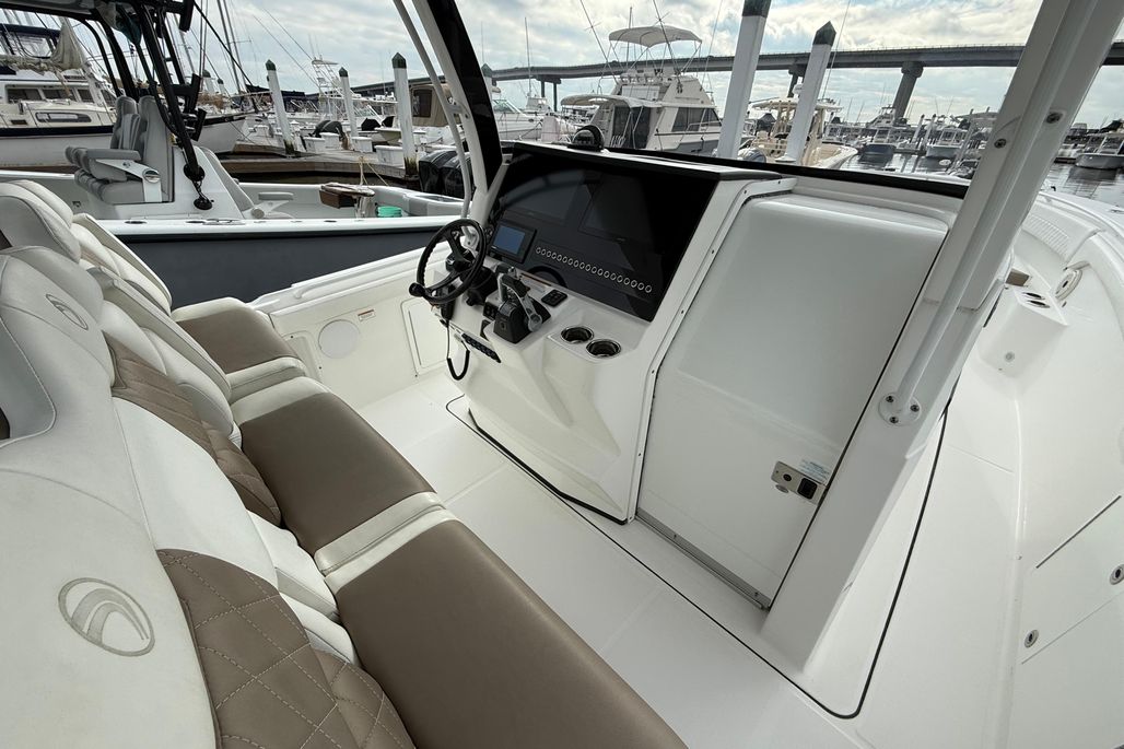 You will not find a more heavily loaded Edgewater 370 CC anywhere. Only 148 engine hours on reliable triple Yamaha 300 outboard power. Joystick steering and a bow thruster make maneuvering in marinas a breeze. A double stepped hull provides a fantastic ride while its stand up cabin offers abundant overnight accommodations. The 370CC is an offshore battlewagon which also offers family friendly cruising amenities like a BBQ grill, a diesel generator, cabin air conditioning and abundant forward and cockpit seating. Easy to see only 20 minutes from Charleston International Airport. Notable features include;