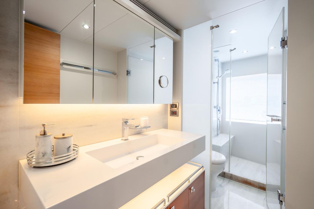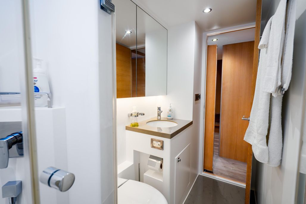 Accommodating up to eight guests, the yacht offers four luxurious cabins. The main deck master suite is a private sanctuary, complete with walk-in wardrobes, a spa-like en-suite, and panoramic views. Additional guest staterooms provide comfort and privacy, while dedicated crew quarters ensure professional service throughout your journey.