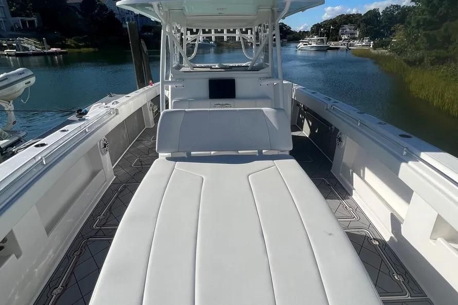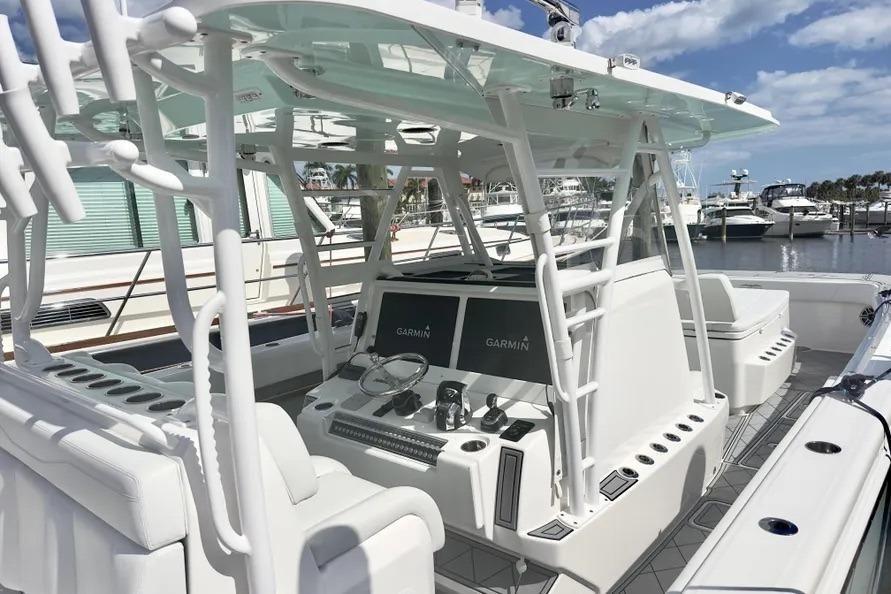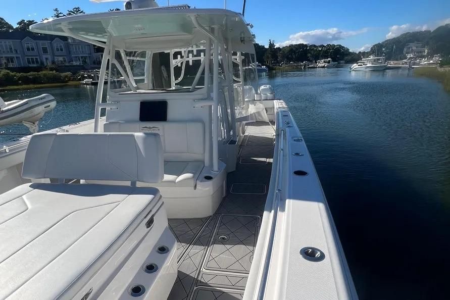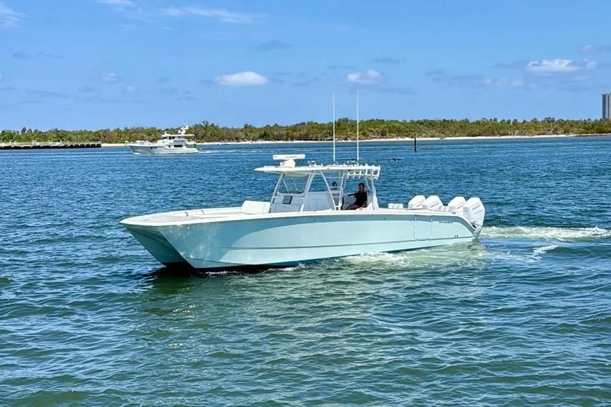 At the helm, fully optioned electronics keep you in command: twin 24″ Garmin displays, side sonar and FLIR feed clear intel day or night, and Starlink brings reliable connectivity offshore. Recent Mercury V10 400s show roughly 40 hours, and the boat presents clean with ceramic coating and captain-maintained care. This is a best-value, price-reduced 40 Cat that’s turnkey for serious runs.