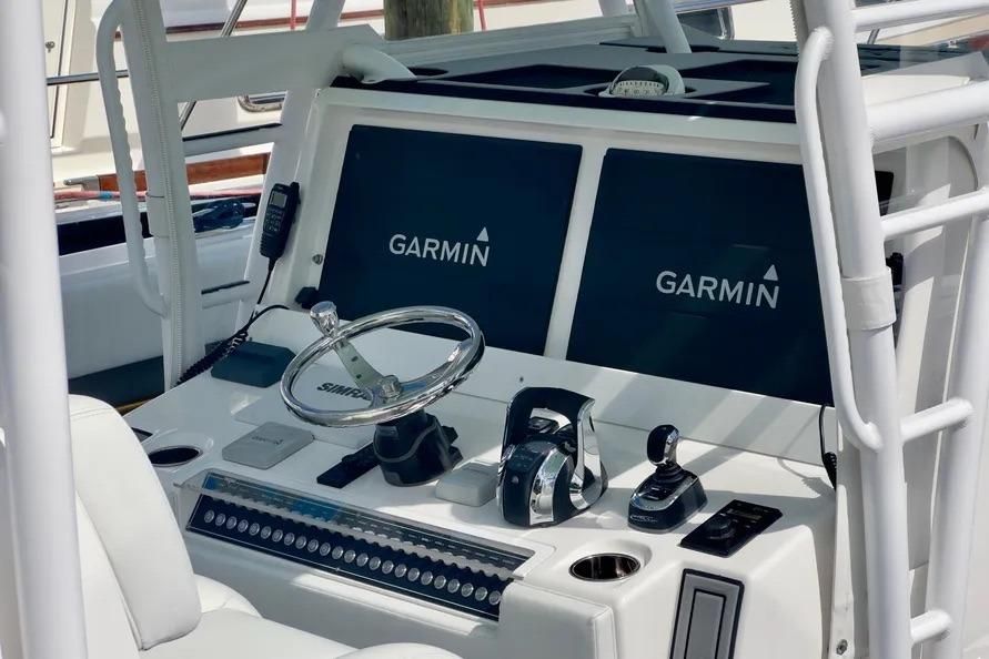 Dual 24″ Garmin multifunction displays · side-scan sonar · FLIR night vision · Starlink connectivity