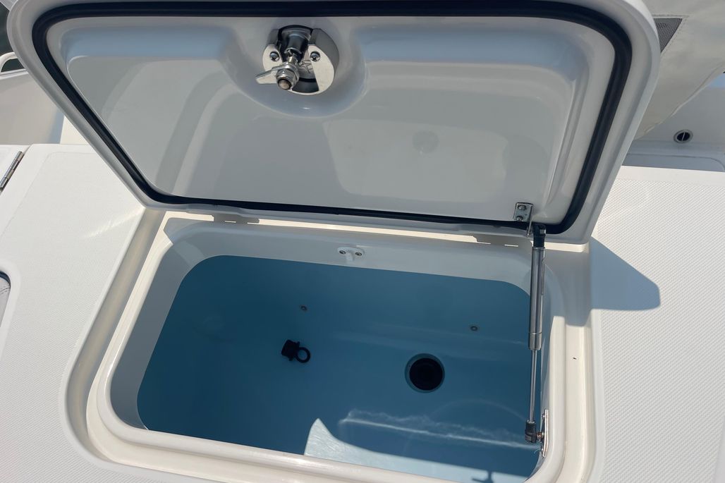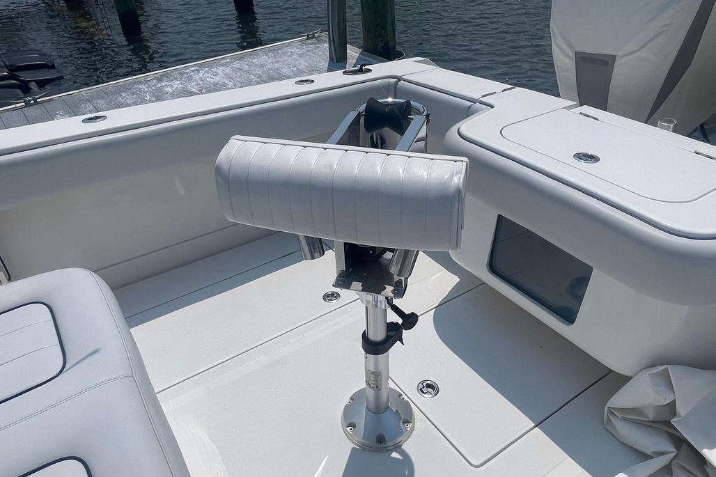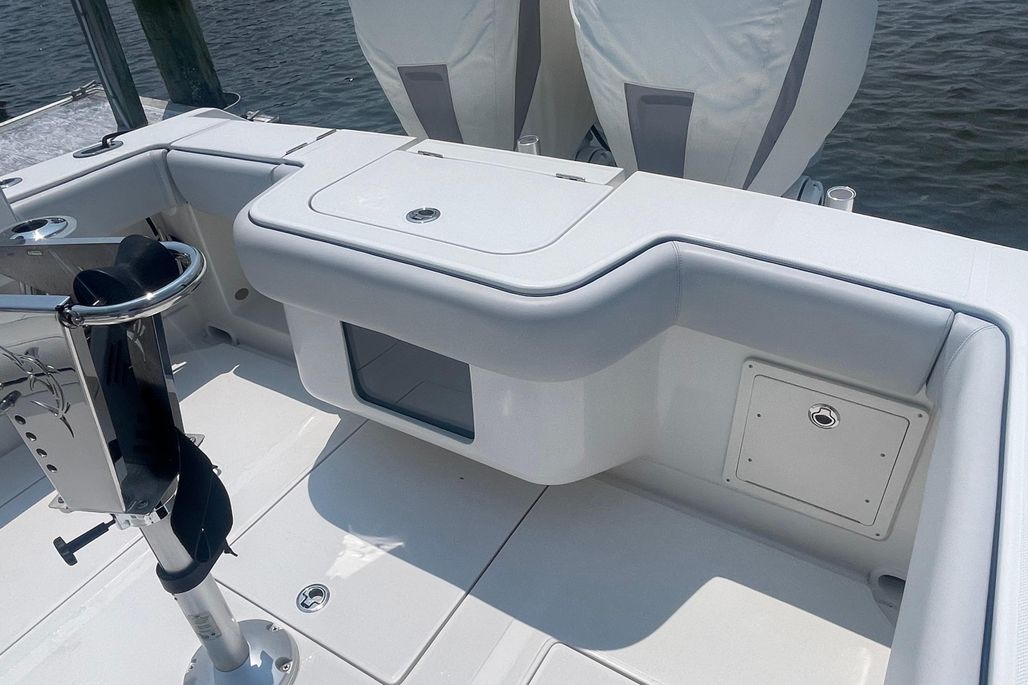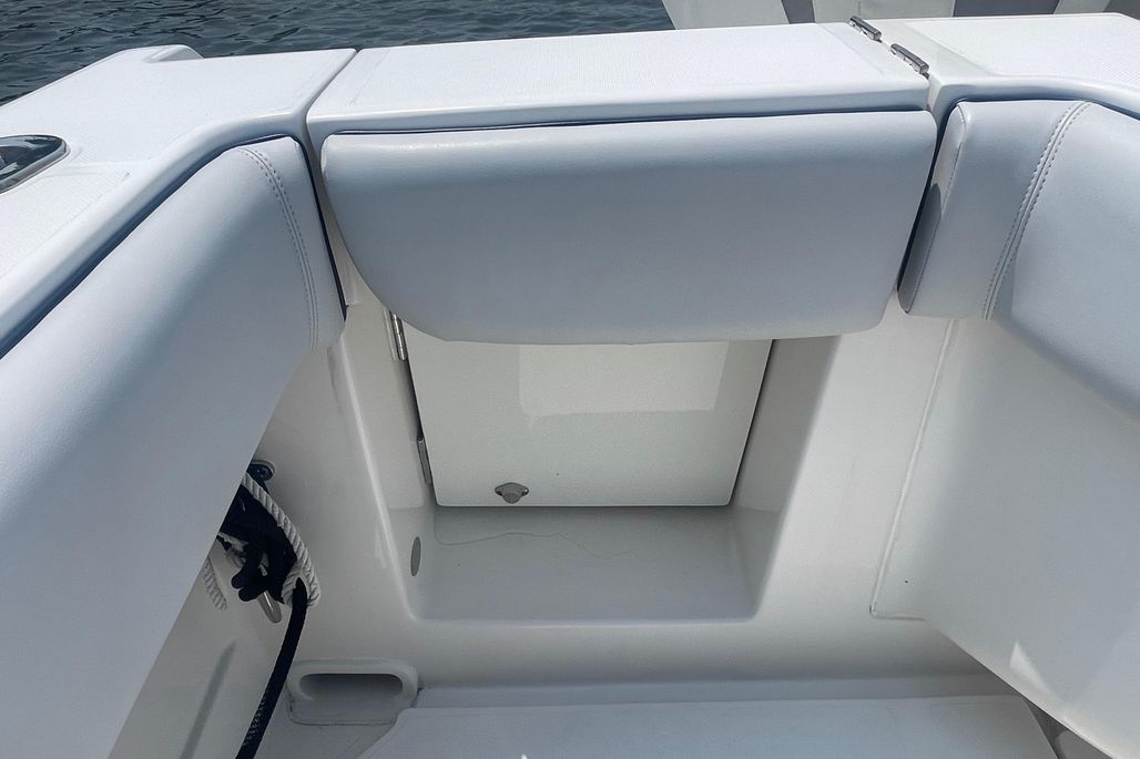 - Forward seating with cushions, forward facing, removable backrests with Release Marine ladder-back teak also just refinished in May 2025 by Release Marine. Igloo cooler, cupholders, low profile grab rails.