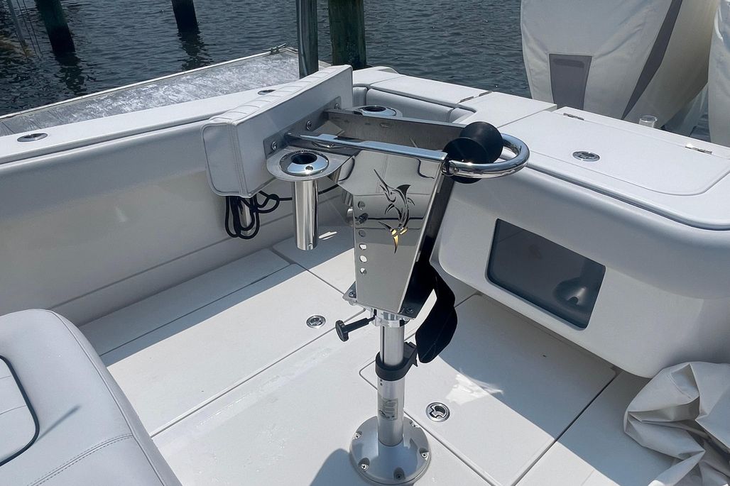 - Mezzanine seating, Leaning post battle station with rod holder, rear jump seats, cockpit combing pads, side dive door and rear tuna door make this cockpit rival any large sportfish boat
