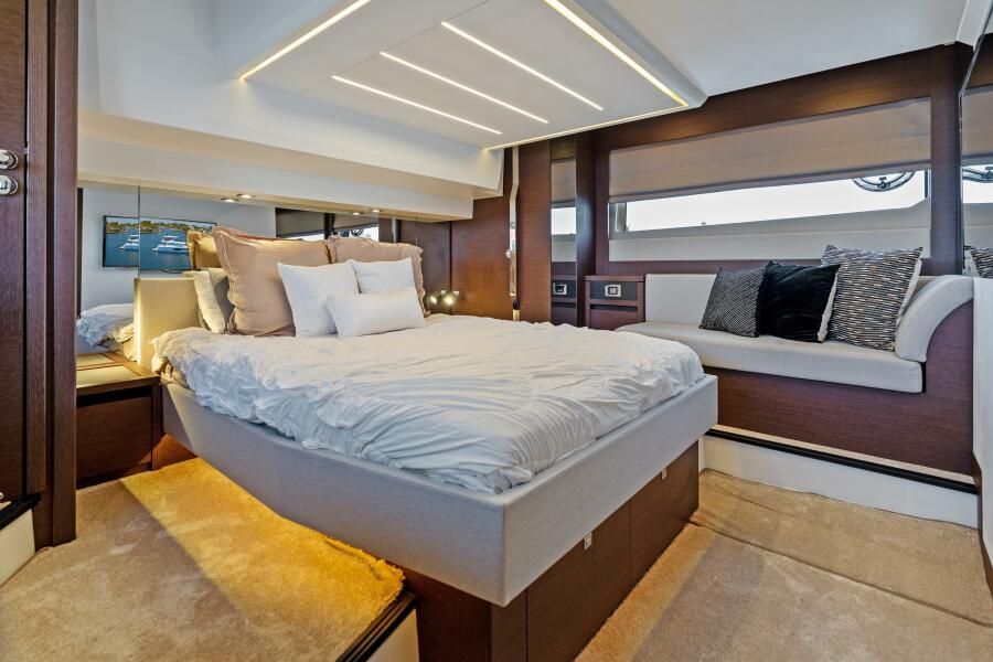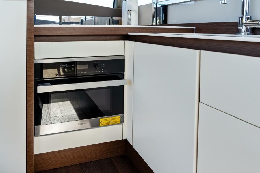 Access to the cockpit and a large L-shaped saloon with the lower helm to starboard and 3 staterooms below and two heads.The full beam master is aft with the exclusive private entry by the galley, which allows privacy and separation from the other staterooms.