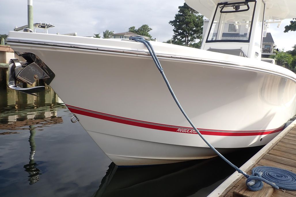 Whether you are ready for an offshore run or spending a casual day closer to shore, the 23 has you covered, offering unbelievable stability and comfort in true Regulator style. The Regulator 23 boasts big game fishing benefits, including a transom tuna door, 46-gallon fishbox/livewell, and 350-quart in-deck fishbox, along with a convenient rigging station and plenty of storage. Standard big boat features include our signature T-Top with integrated wraparound windshield for more protection at the helm and factory-installed Garmin® 16 Fish Package. The 23 also features abundant seating, built-in coolers, and a suite of optional amenities, including through stem bow roller with anchor windlass, head with electric tank pump, watersports tow bar, and forward sun shade – ideal for entertaining and discovering the best of life on the water.