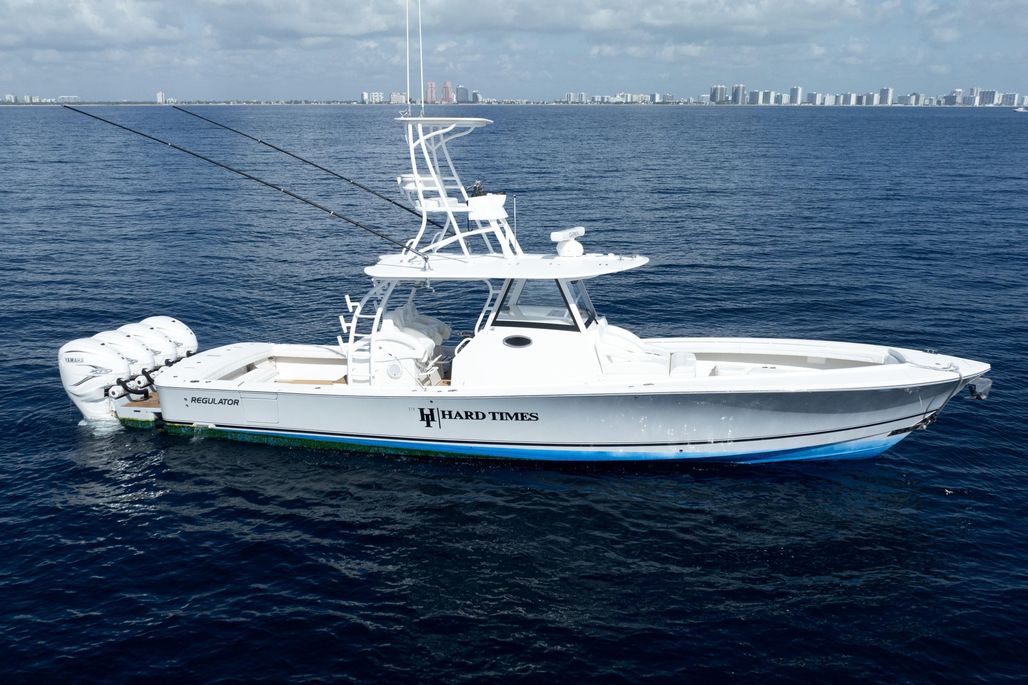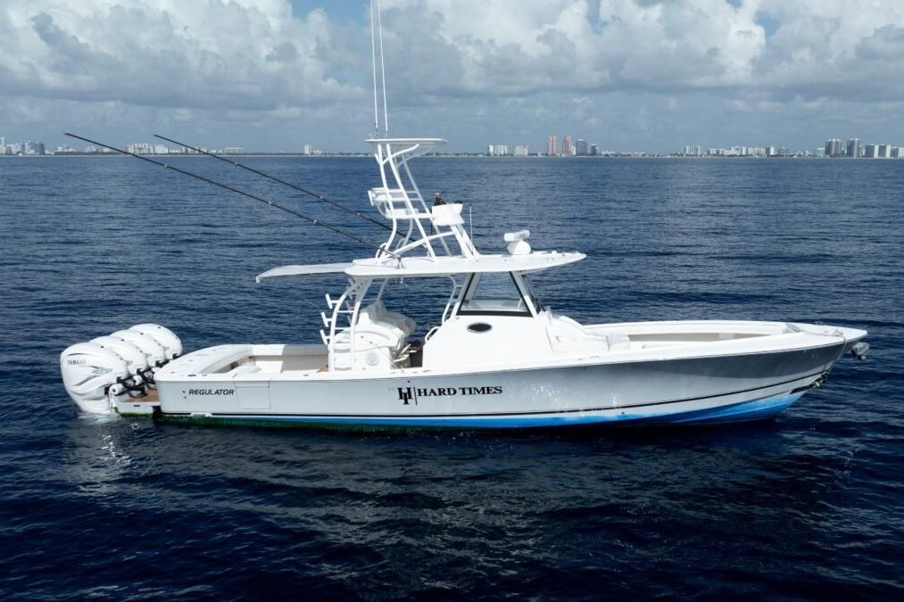 Experience the thrill of boating life with the Regulator 41, a world class offshore fishing vessel. Featuring a center console, a sturdy tower, 14 rod holders, and an advanced Garmin electronics package, every adventure is at your fingertips.