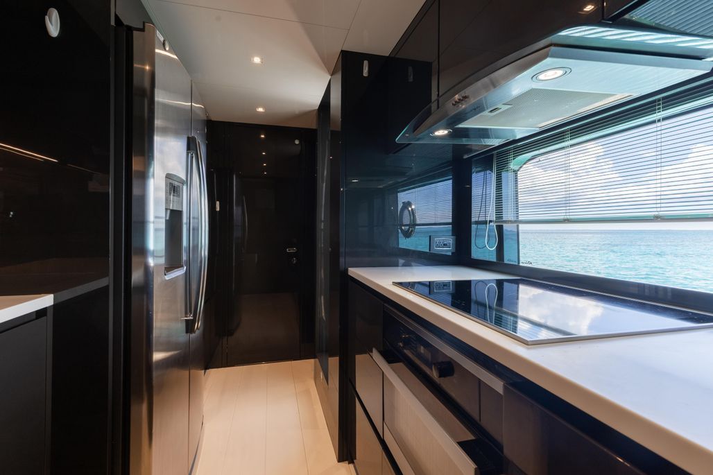 Step inside and you’re immediately immersed in natural light. The salon is surrounded by full-height glass windows that dissolve the boundary between interior and sea, creating an airy, open ambiance that evolves with every hour of the day. The layout is designed for both relaxation and entertaining—featuring a spacious lounge area aft, a formal dining space amidships, and seamless access to the aft deck through sliding glass doors.