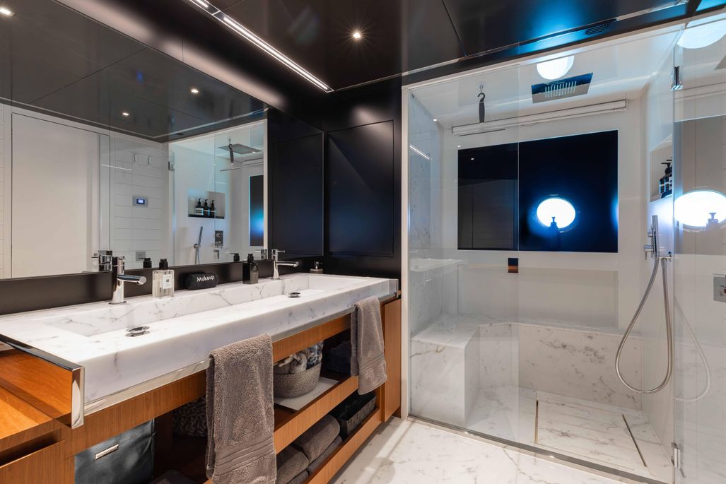 All guest cabins include en-suite bathrooms and share the same refined styling and generous headroom found throughout the yacht.
