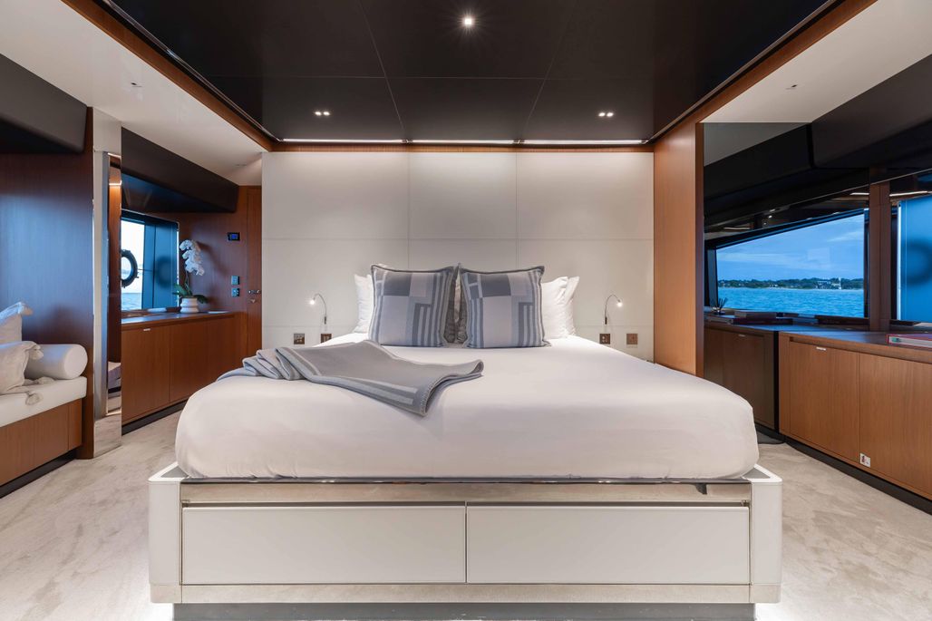 Rare for her size, KIYOMIZU features a full-beam master suite on the main deck, offering panoramic views, a private ensuite with walk-in shower, and a walk-in wardrobe. Below deck, the guest accommodations include: