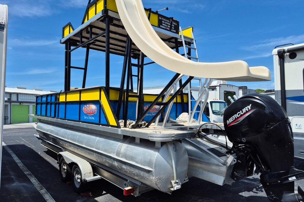 Lifting strakes, water slide, large stern deck, welded aluminum rub rail, under deck aluminum skin, Simrad GO 7 GPS/Chartplotter. Twin Power Pole anchoring system, cocktail table, 4 corner loungers, forward Bimini top etc. 15 person or 3000 LB USCG capacity,