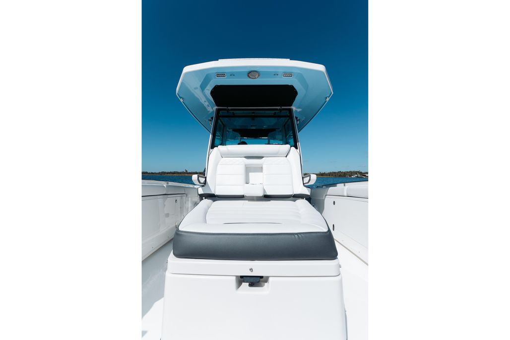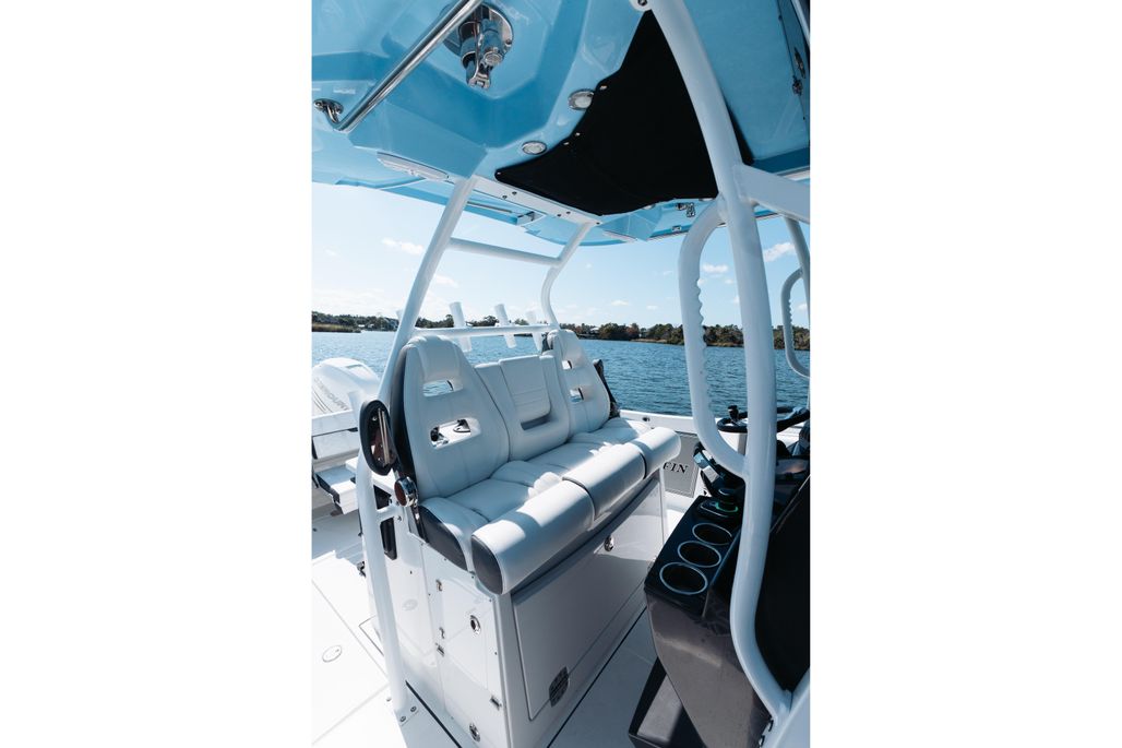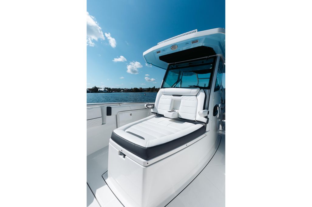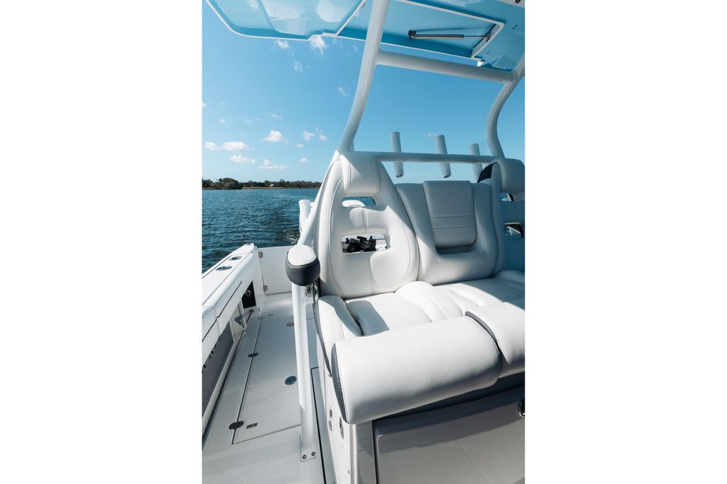 Enjoy an abundance of perfectly designed fishing amenities like a tackle rigging station, insulated baitwells, and in-floor fish boxes as well as modern conveniences such as integrated storage, custom seating, dive/boarding door, telescoping, and recessed swim ladder, and full-size head compartment with Pantographic door. Meanwhile, captains will appreciate the leaning post with a custom helm seat, flip-up bolster, and command center.