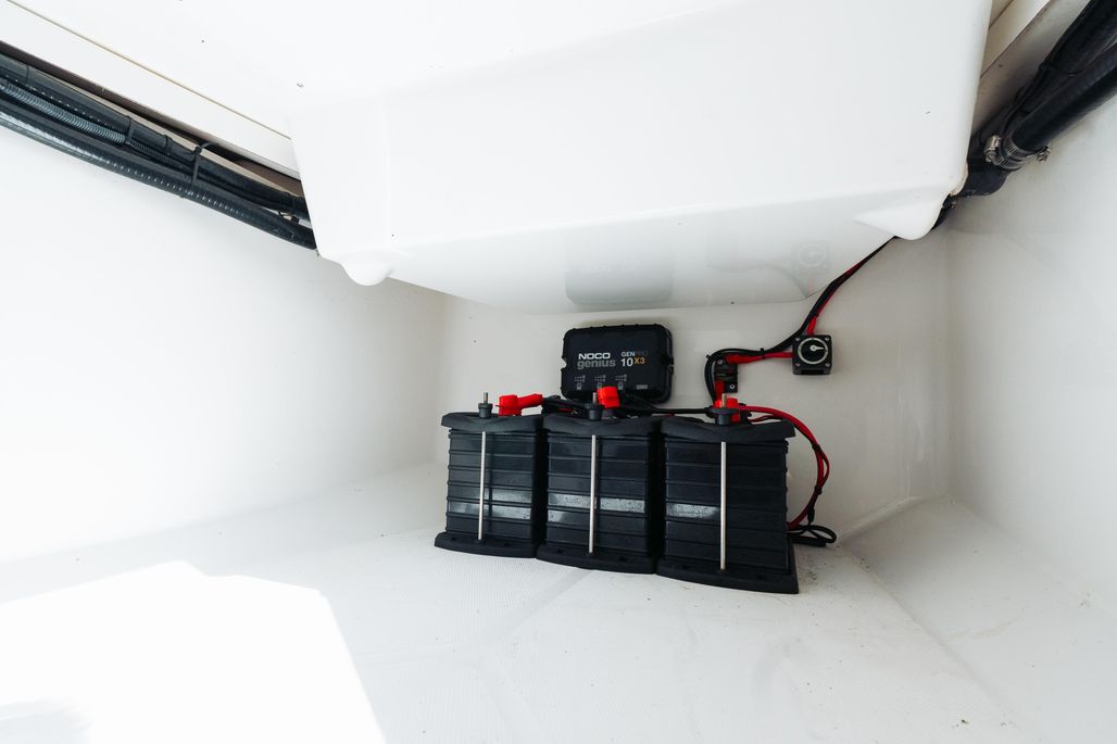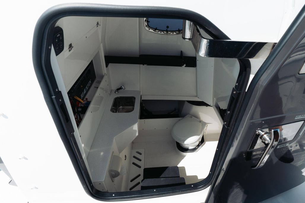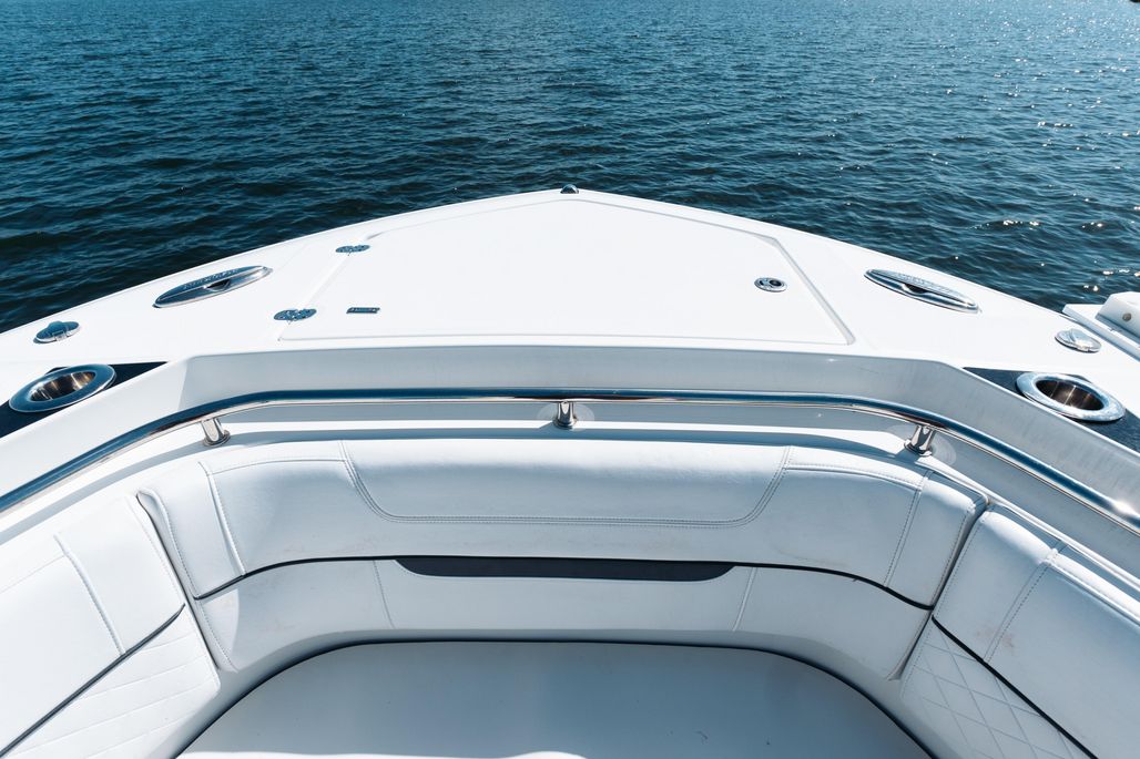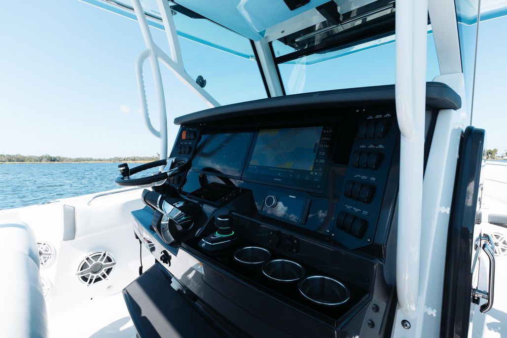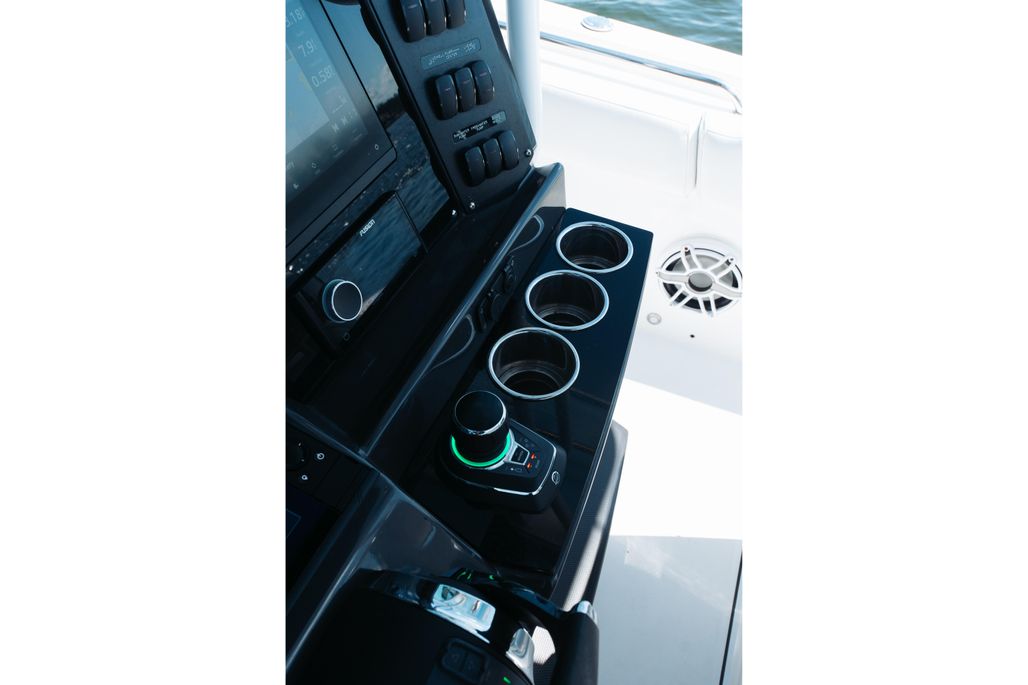 Enjoy an abundance of perfectly designed fishing amenities like a tackle rigging station, insulated baitwells, and in-floor fish boxes as well as modern conveniences such as integrated storage, custom seating, dive/boarding door, telescoping, and recessed swim ladder, and full-size head compartment with Pantographic door. Meanwhile, captains will appreciate the leaning post with a custom helm seat, flip-up bolster, and command center.