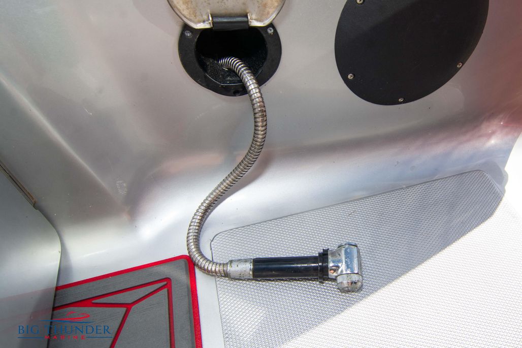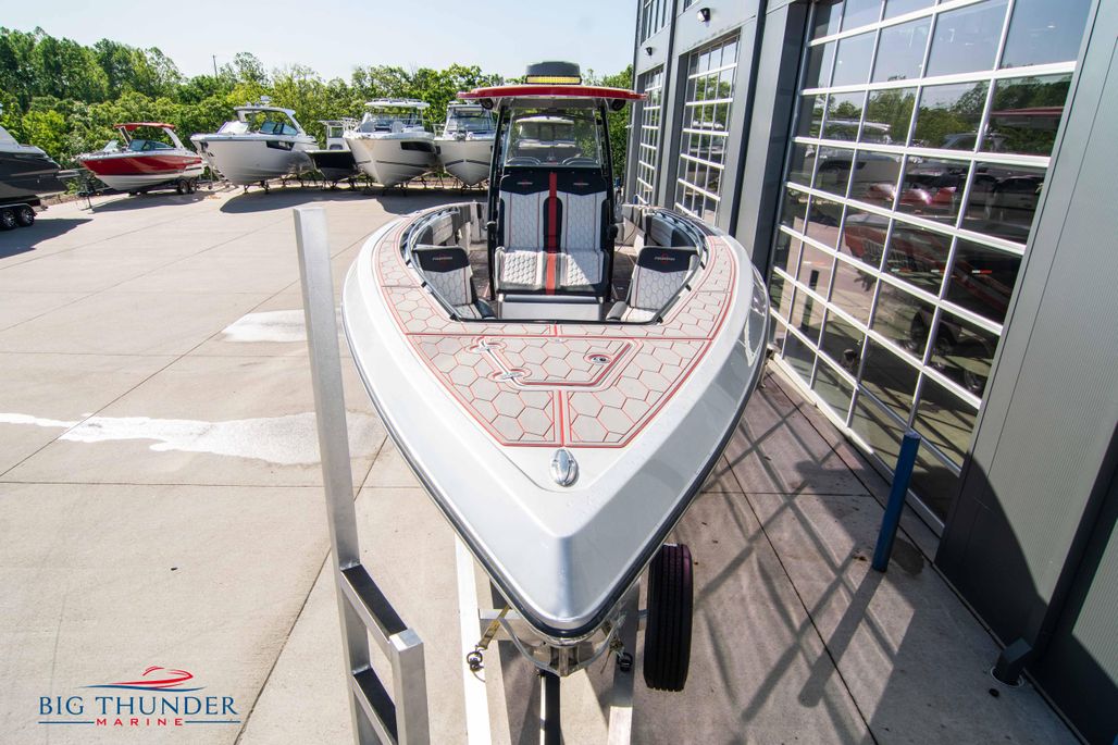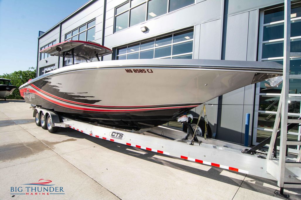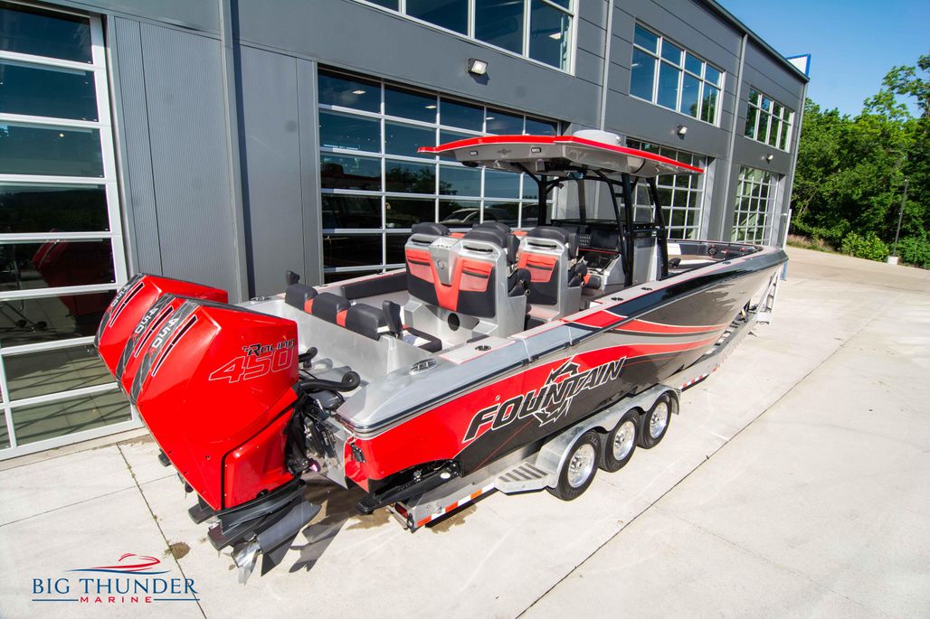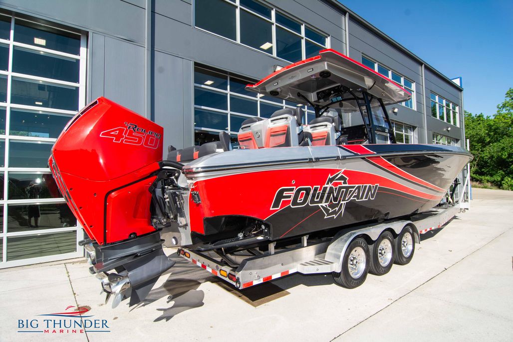 2021 Fountain 38 SC Triple Paint Matched Mercury Racing 450R Verado's (373 hours). Reverso Automatic Engine Flushing System. Custom Paint & Graphics w/ Matching Console, Helm, & T-Top. Hard Top SeaDek Insert. Livorsi 1150 Hydraulic Trim Tabs. Bow Thruster. Thru Hull Anchor Windlass/Rode Kit, Striker Plate, Polished SS Plow, 15’ of 5/16"" Galvanized Chain, 150’ of 5/8"" 8-Strand Braided Rope. Black Cool Touch Interior Vinyl Upholstery w/ White Alpah Quilted Panels, Bright Red Hitch Accents & Piping, White Hex Pattern Stitching & Dark Gray Embroidered Logos. Stitched Sport Leather Steering Wheel. Additional USB Outlet in Dash. Screened Portlight. Starboard Side Cockpit Dive Door w/ Ladder. Shadow-Caster RGB Cockpit & Underwater Lighting Control System. Garmin xHD 24" Dome Radar. Dual GPSMap 8616 16" Displays. Vessel View 903 Engine Monitoring Display. Garmin 215 AIS VHF w/ Antenna. Premium Audio System (Fusion Touchscreen Entertainment Center w/ Built In WiFi, (4) JL 6.5 LED Spkrs., (6) 7.7 LED Spkrs., (2) 8.8 LED Spkrs., (4) 10"" Subs, (2) 600W 6 Ch Amps & (2) 600W Mono Block Amps). (2) Additional 7.7" Bow Speakers w/ Upgraded Amp. Wireless Stereo Remote. Double Row Stand Up Helm Bolsters w/ (2) Additional Subwoofers. Additional 20 Gal. Fresh Water Tank (30 Gal. Total)