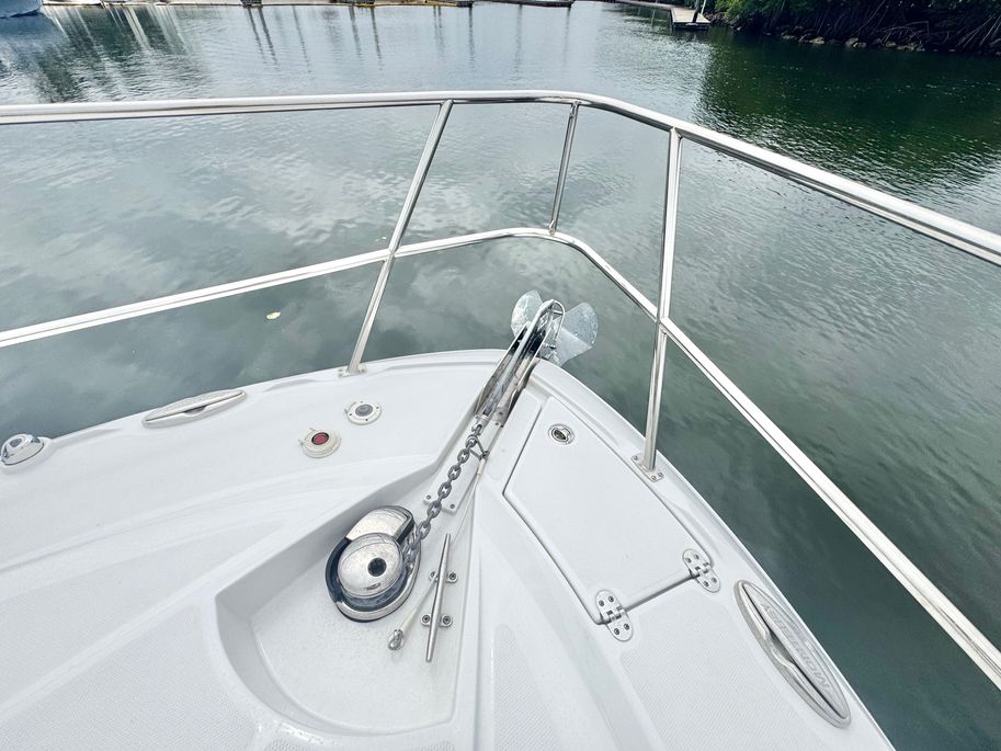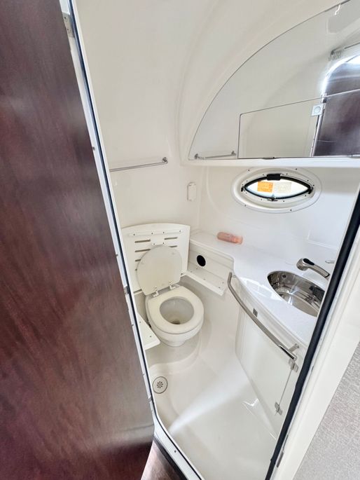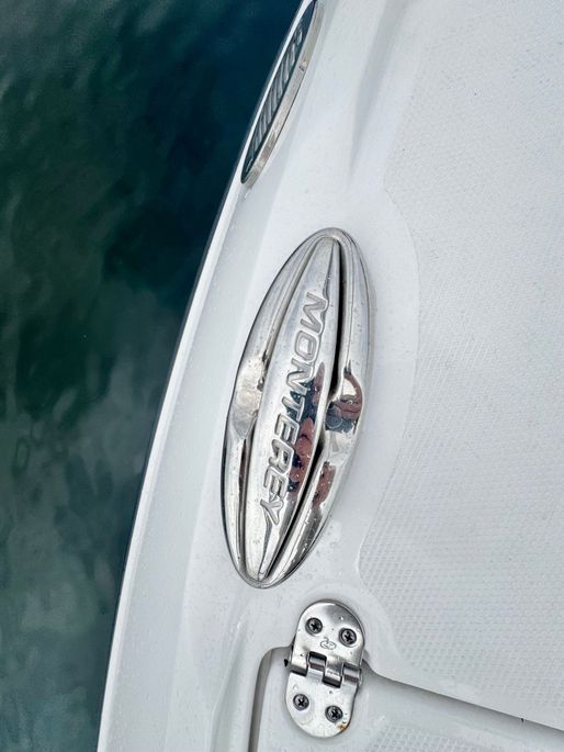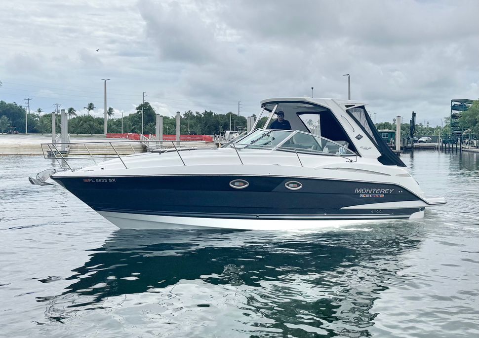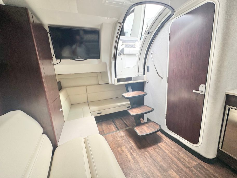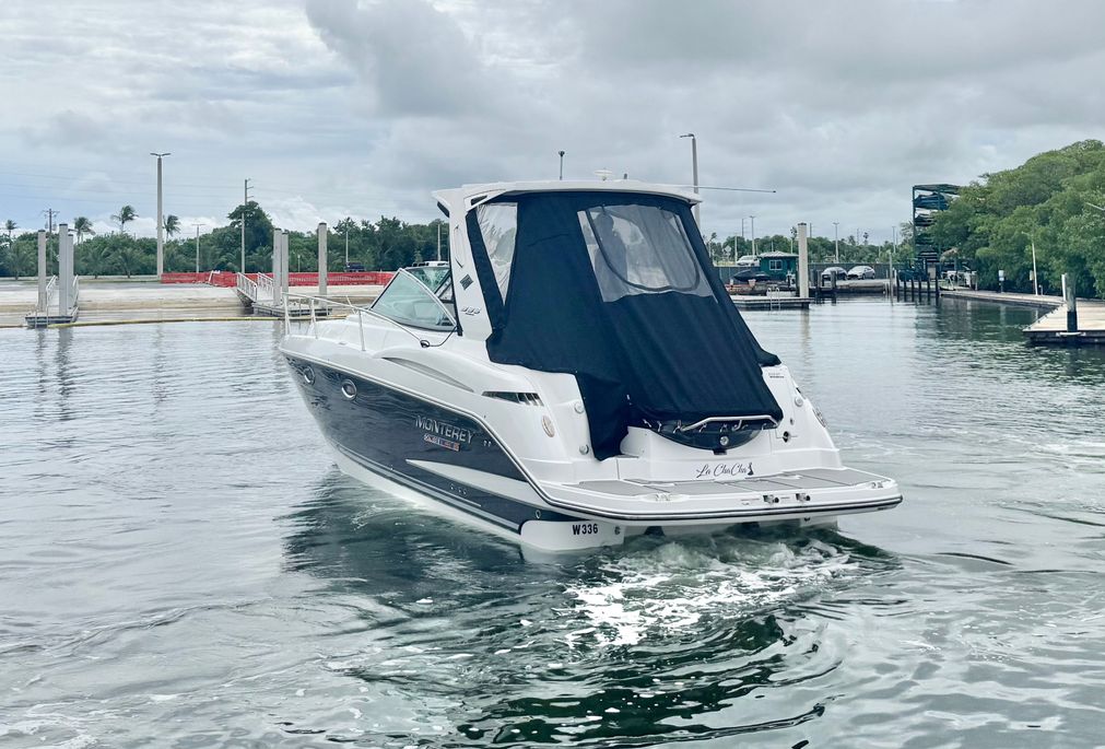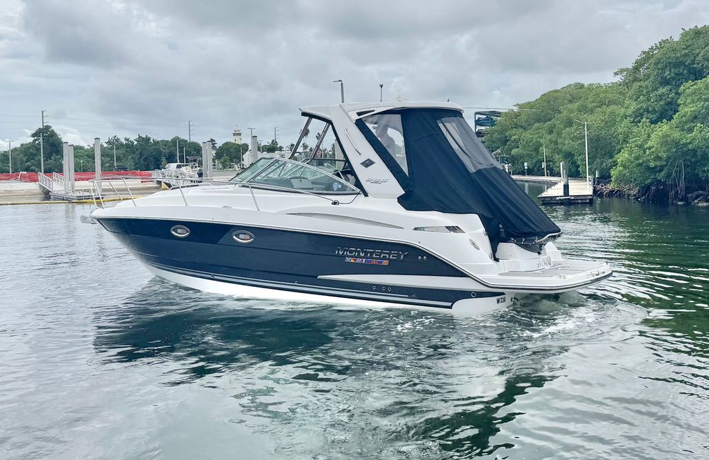 Below deck, the cabin is a testament to Monterey’s commitment to luxury and functionality. The open and airy salon includes a well-appointed galley with a microwave, refrigerator, and solid-surface countertops. The forward V-berth and an aft cabin provide comfortable sleeping arrangements for four, making it perfect for weekend getaways.