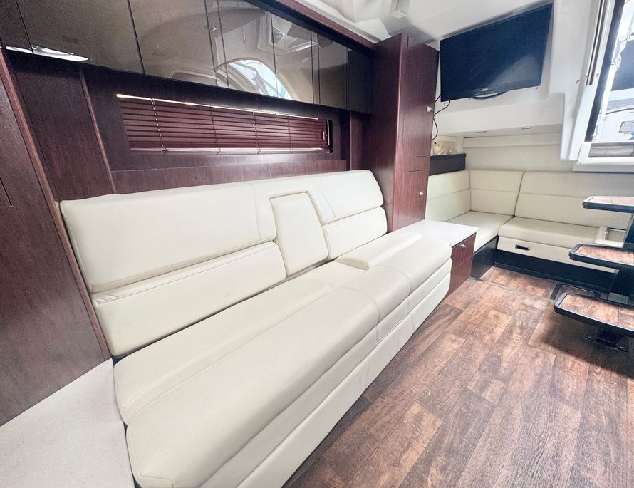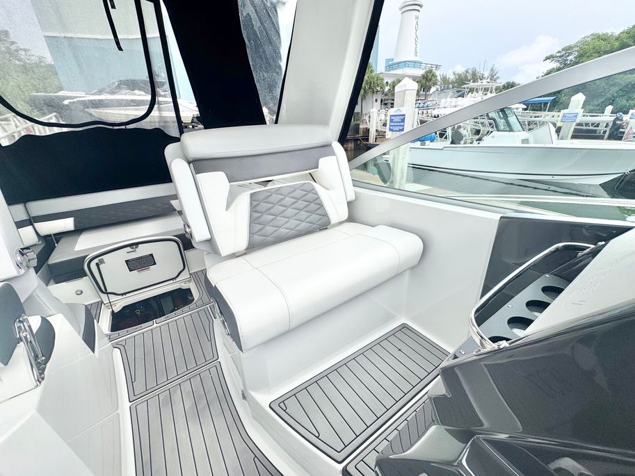 The 335 Sport Yacht is designed for both exhilarating days on the water and comfortable overnight stays. The spacious cockpit features ample seating for entertaining, a wet bar, and a versatile sun lounge that can be configured for relaxation or dining.