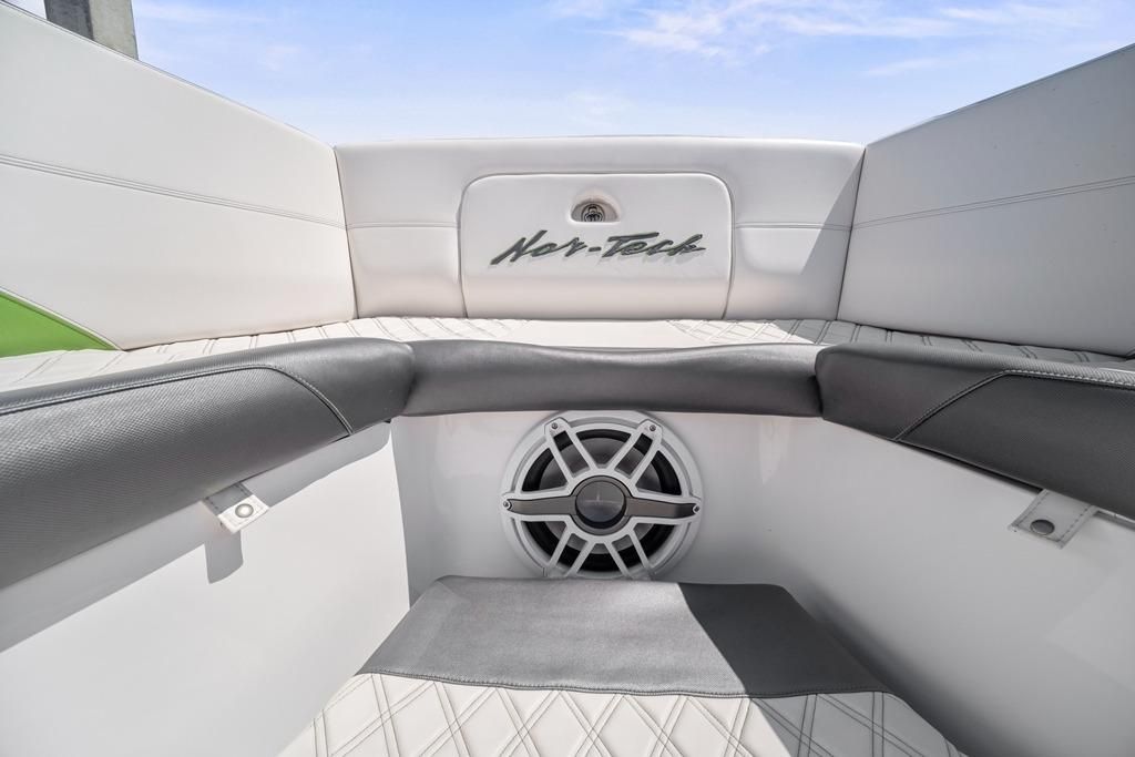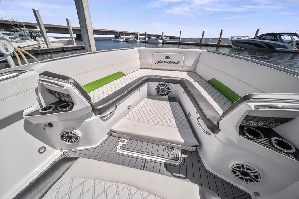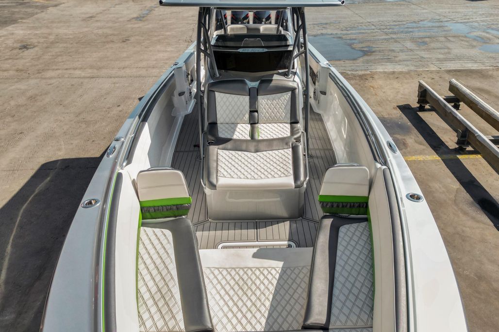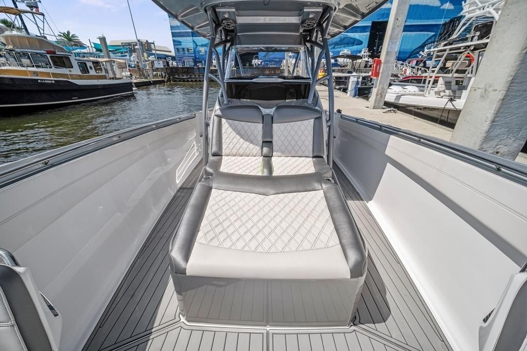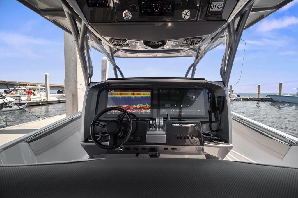 Step into the cabin and you’ll find cold A/C and a porcelain electric-flush toilet with holding tank—perfect for long days offshore. The upgraded JL Audio stereo system brings concert-level sound, and the quad-engine flush system makes maintenance a breeze.
