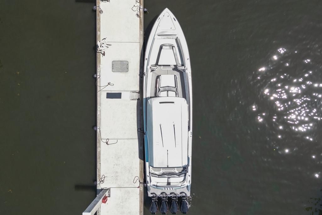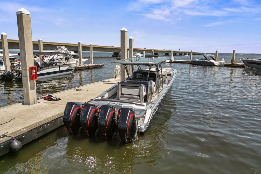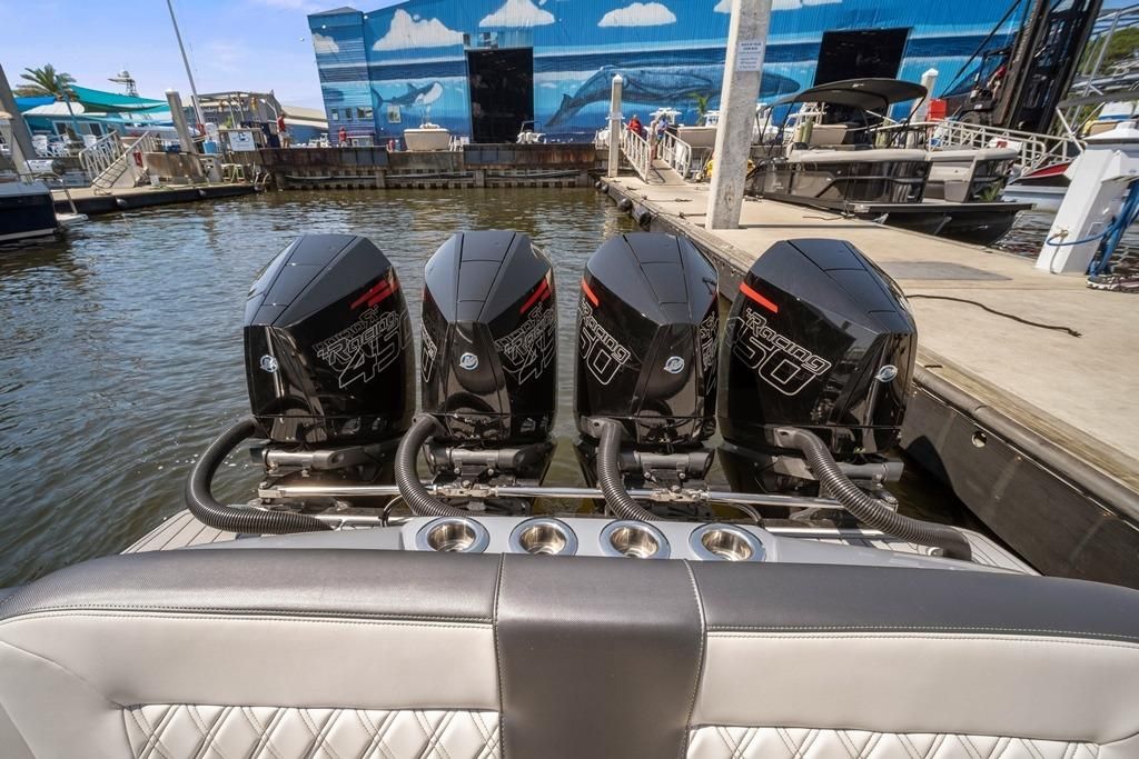 Quad 450R V8 Mercury Racing engines deliver raw acceleration and effortless cruising. Combine that with 370 gallons of fuel, and you’ve got more range than most performance boats on the water.