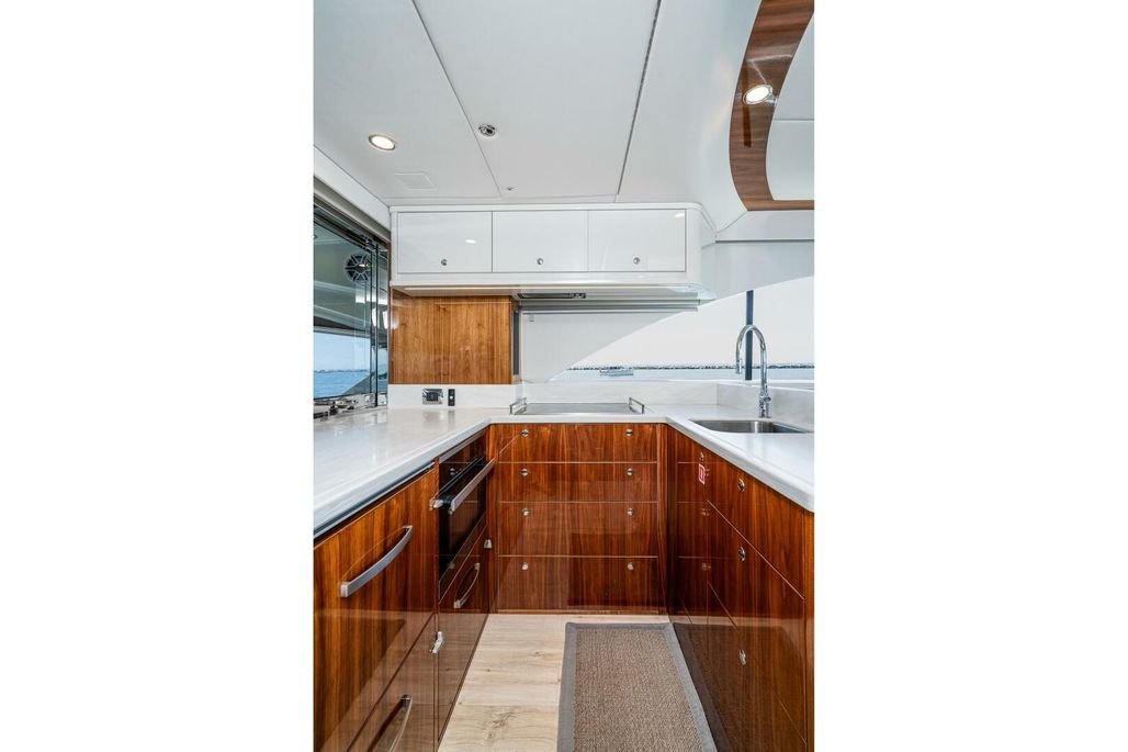 Through the sliding salon doors, the galley sits aft on the port side. Riviera always features more refrigeration and appliances than any other boat in class. This is evident with the drawer dishwasher and six drawers for refrigeration and freezing. Plenty of storage, convection oven, and induction burner make the galley as capable as any household kitchen. The salon sits forward of the galley, with two L-shaped lounges face each other with the port lounge having a high-low table that converts to a day bed for lounging or another berth. For nice nights on the hook without the generator, dual overhead sunroofs, sliding windows, and hinging galley window can all open to give natural ventilation underway or at rest. Despite lots of seating and a large galley, the salon area has tons of storage which is a staple for Riviera, something European builders often lack. The entire salon and galley area have durable vinyl flooring, which looks the exact same as wood floors but is more durable and easier to replace planks for damaged areas.