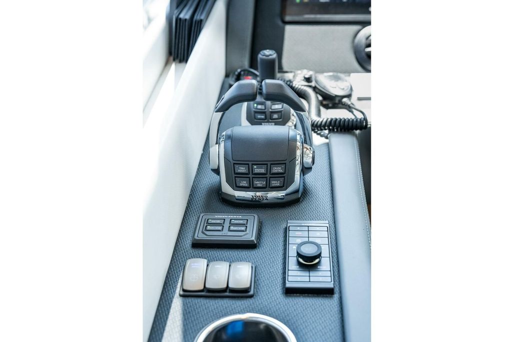 The helm leaves absolutely nothing to be desired. Visibility is phenomenal on all sides thanks to large windows, including the aft bulkhead. Three 17” Garmin screens are integrated with engine room cameras, radar, sonar, and Volvo Glass Cockpit. For even more screen real estate, a dedicated 7” Volvo display sits under the Garmin units and is networked as another Garmin display. A SeaKeeper display, chain counter, spotlight control, bow thruster control, and Czone display round out the rest of the fully complimented helm. Adjustable seats and tilt steering wheel keep the captain comfortable for longer trips.