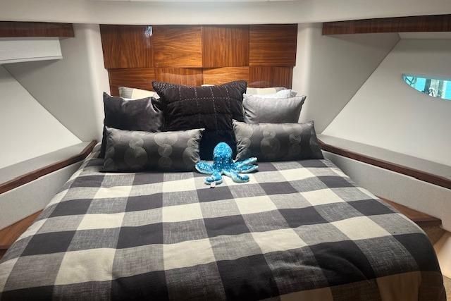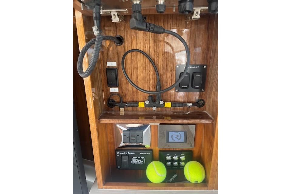 The helm is fully equipped with engine displays, bow and stern cameras, bow anchor camera, night vision camera, bow thruster, windlass anchor controls, spotlight switch, Seakeeper display, and motorized dual antennas. Port and starboard joystick docking stations are also located at the aft of the vessel for effortless maneuvering.