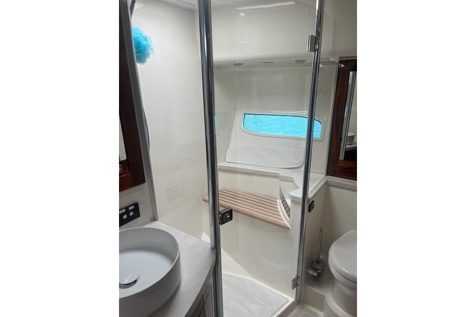 Below deck, the accommodations are thoughtfully arranged for owners and guests alike. To port, a versatile lounge converts into an additional berth. The full-beam master stateroom features a walk-in closet, additional walk-in storage with engine room access, large hull windows, a spacious ensuite head with bidet seat, and a large TV. Forward are two guest staterooms to port and starboard, each with twin berths and TVs, followed by a forward VIP stateroom with a private ensuite and TV. In total, the yacht offers three staterooms and three heads.