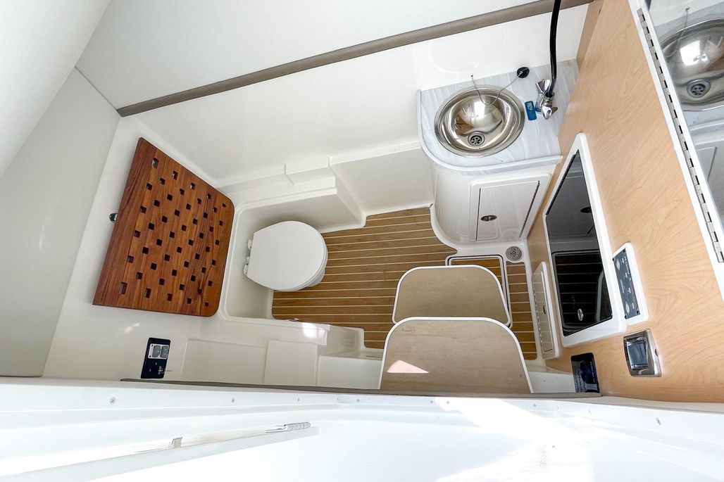 Joystick steering, diesel generator, air conditioned stateroom, head, helm with full Strata Glass enclosure and Electric Retractable Cockpit Sun Shade, Pool Style Dive / Swim Ladder, Live well Fish Box