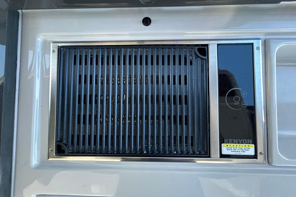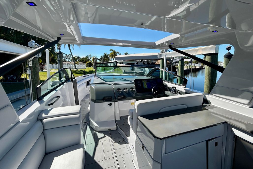 The premium helm is a captain's dream, featuring Two Cooled Cup Holders for chilled drinks at your fingertips, a Radar 4k UHD, and a sophisticated electronics suite with both Garmin and Simrad displays for intuitive navigation, charting, and system monitoring.