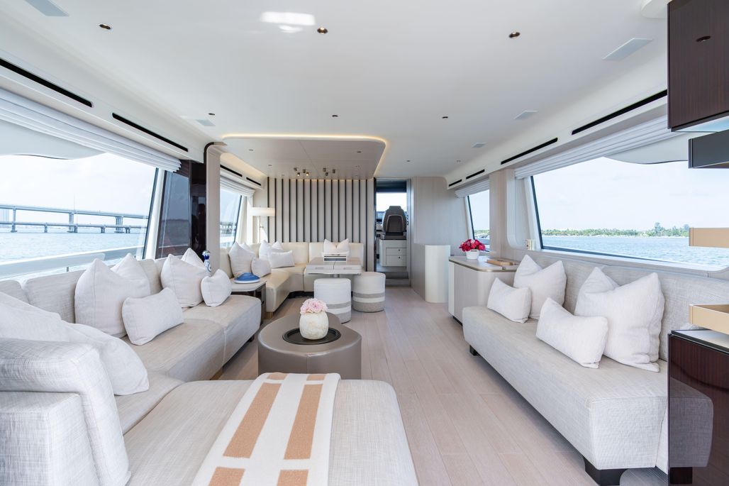 Performance and handling are a standout, powered by triple Volvo IPS 1000 HP engines and enhanced by Dynamic Positioning System (Skyhook) and Seakeeper stabilization. These systems work together to deliver smooth cruising, excellent maneuverability, and stress-free docking in a wide range of conditions.