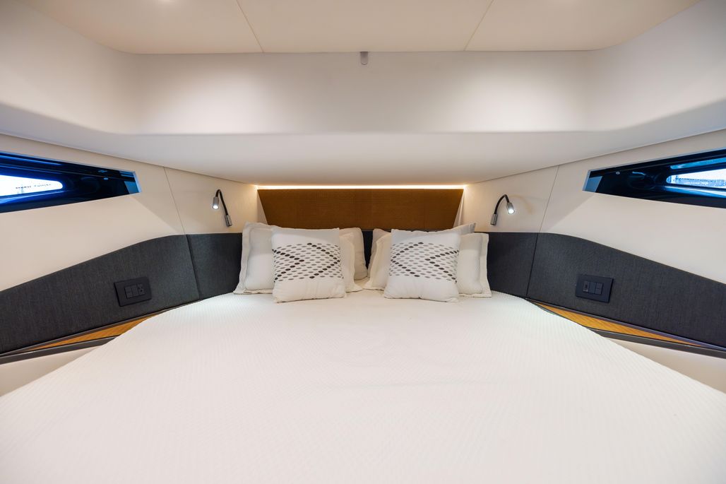 A bold fusion of performance and artistry, this 47-foot Azimut Verve embodies the pinnacle of open-sport-yacht design. Sculpted by Azimut’s renowned Italian styling studio and powered by quad Mercury 450R outboards, it delivers a commanding top speed approaching 50 knots while maintaining the grace and refinement expected from Europe’s premier luxury builder. From every angle, the Azimut 47 Verve exudes confidence—sleek hull lines, carbon-fiber accents, and a perfectly proportioned profile that balances raw performance with yachting sophistication. Designed for owners who demand the exhilaration of a sport boat with the comfort of a motor yacht, the Azimut 47 Verve blends agile handling with the confidence of Azimut’s deep-V hull and meticulous craftsmanship will ensure an unforgettable experience every time you step aboard.