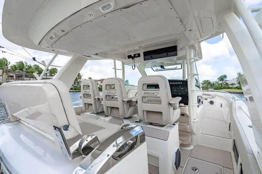 Layout and finish deliver Boston Whaler’s flagship experience, helm seating for six that flips forward or aft, a push-button sunshade, SeaDek underfoot, and a bright cabin with V-berth, enclosed head, and rain-shower. Add the upgraded helm screens, 55″ radar, and half tuna tower, and you’ve got a turn-and-go platform for offshore runs or refined family days.